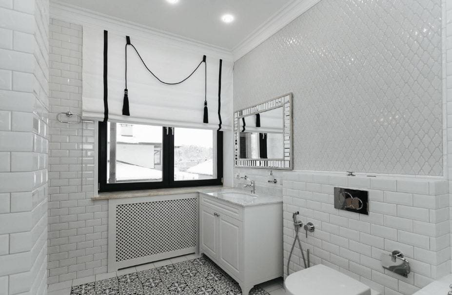 На пол можно постелить коврик с полосками в этих же цветах. Классический вариант пола в такой ванной – это расположение белых и черных плиток в шахматном порядке.