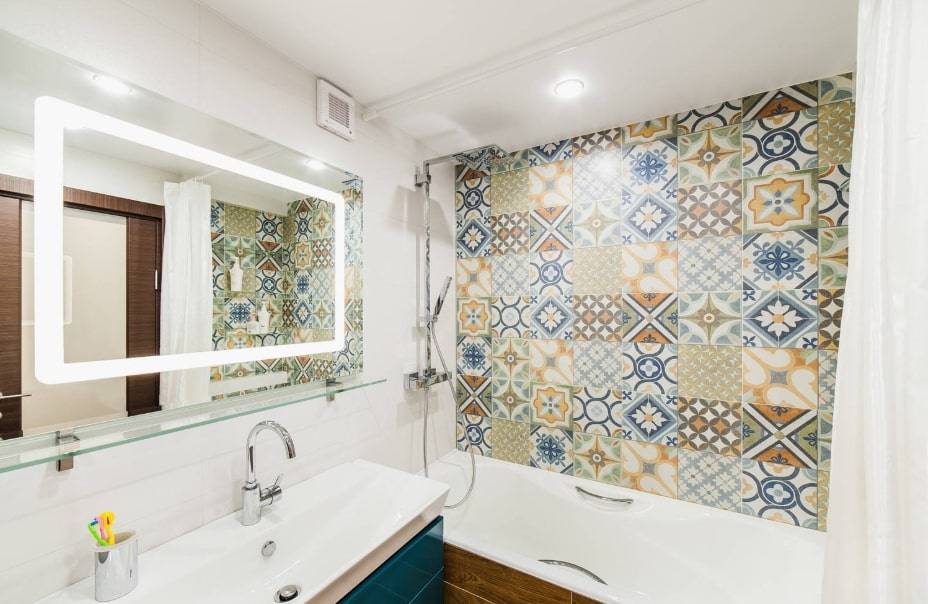 Декоративный экран из мозаики сочетается с рисунком занавески. Ванная встроена в надежную конструкцию, бортики которой защищают от попадания воды на поверхность пола.