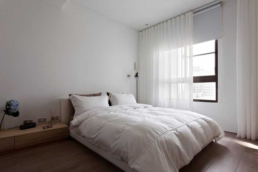 Недостаток квадратов в спальне компенсируют хорошим освещением и светлой отделкой. Огромные окна не драпируют или используют жалюзи в тон стен. Снежную стерильность дизайна подчеркивают темные полы и мебель, серый текстиль. В изголовье кровати часто монтируют полку с живыми растениями и семейными фотографиями. На потолке – светильник простой формы.