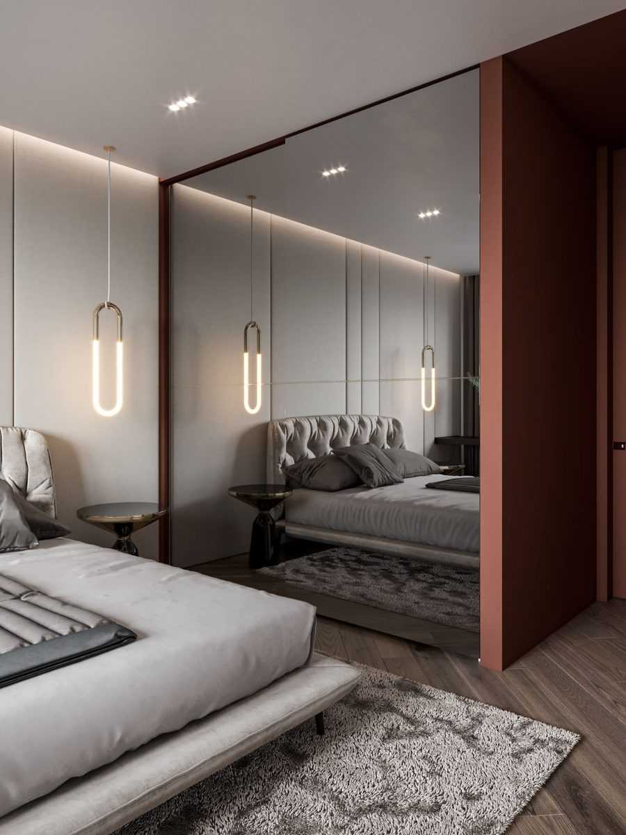 Прямоугольная спальня похожа на «пенал» или «вагон». С визуальным расширением пространства отлично справляются зеркала. Создавая отражения, они расширят спальню в 2 раза.