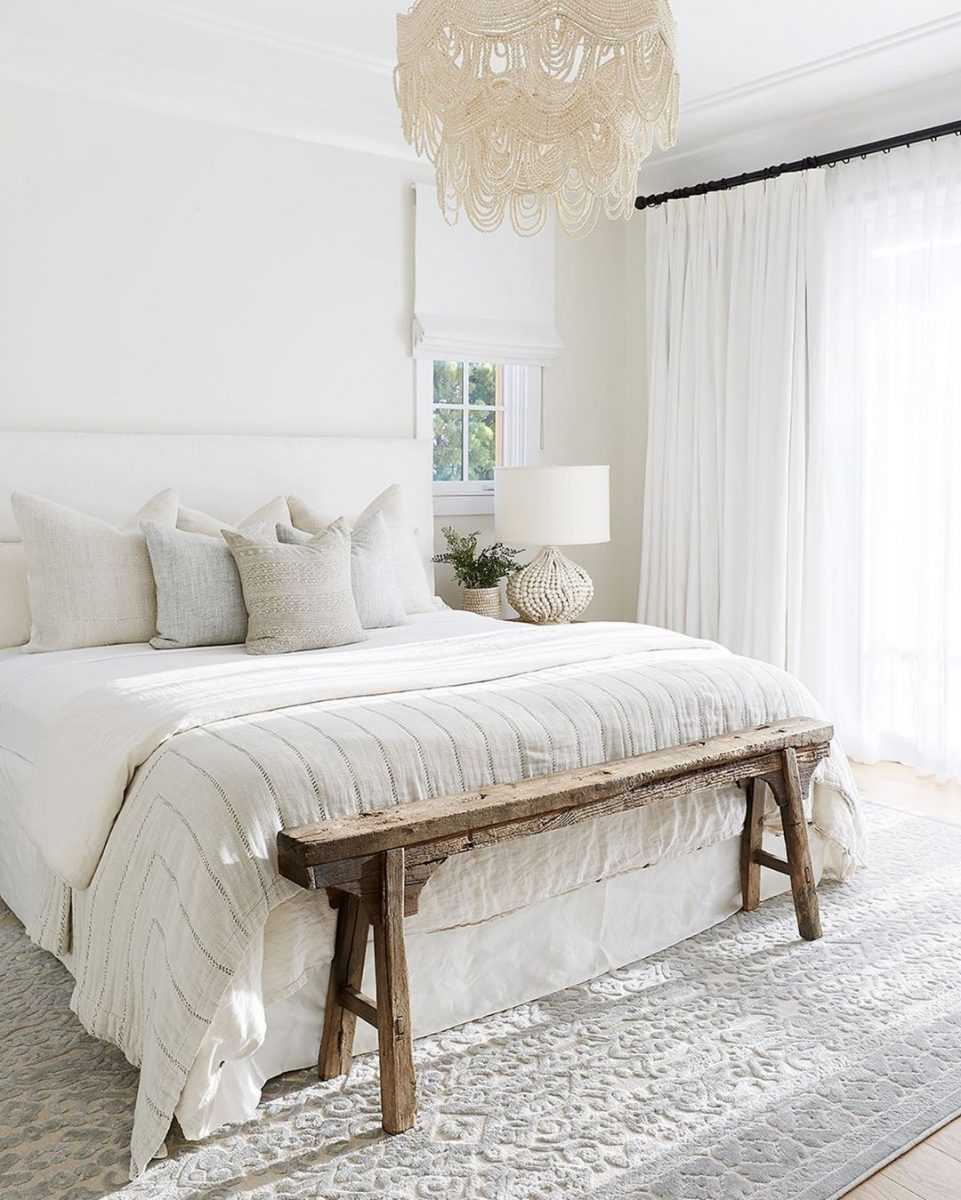На фото прямоугольной спальни можно подробно рассмотреть специфику ее зонирования. Для отделения спального места от зоны отдыха или рабочего уголка можно использовать шторы или занавески из легких материалов, например из бусин или палочек