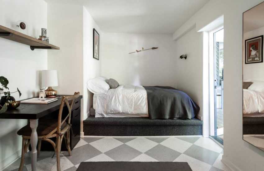 Интеграция пространства, также известная как концепция открытого пространства, является хорошим способом устранения давящего чувства, которое может возникнуть в небольшом замкнутом пространстве. Можно использовать приподнятую кровать, под которой достаточно места для хранения всех необходимых вещей. Небольшой вертикальный шкаф поможет отделить одну зону спальни от другой.
