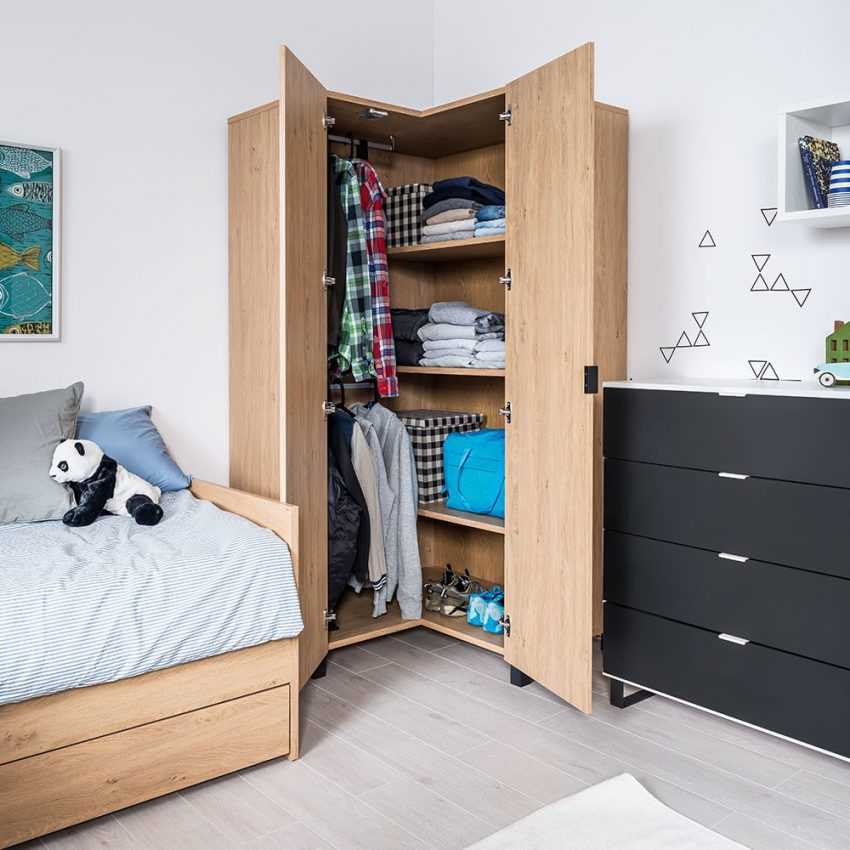 Зачастую комната отдыха предполагает наличие шкафов для хранения одежды. Вместительный гардероб, совмещённый с зоной для сна — популярное решение. Оба помещения выполняются в едином стиле, при этом гардероб отделяется раздвижными перегородками или стандартной дверью.
