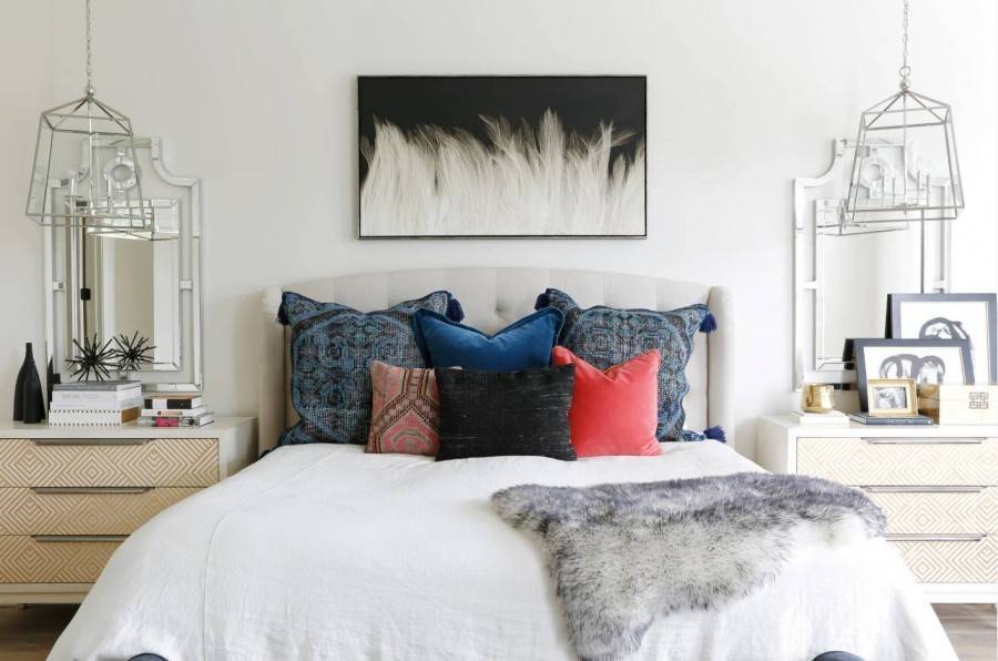 Почти все стены и мебель должны составлять основную цветовую палитру интерьера, например, белую. Поэтому стена за кроватью, декорированная яркими фотообоями поможет слегка разбавить обстановку.