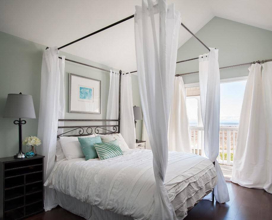 - Кровать подбираем с тонкими колоннами, а не с массивными спинками.