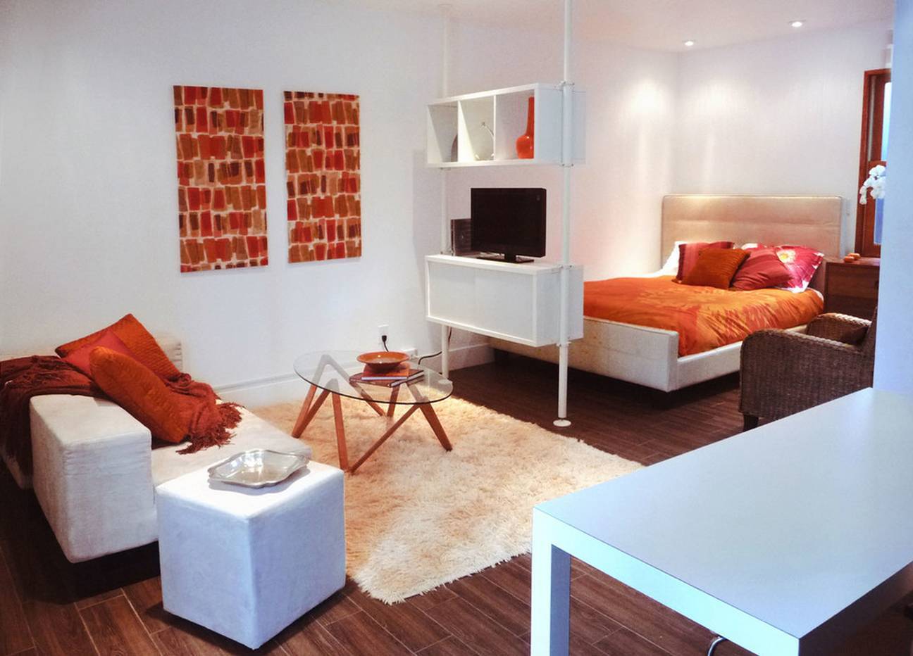 В маленьком прямоугольном помещении обычно ставят декоративную перегородку, делящую все пространство на две главные части. Если речь идет о спальне, то в одну зону ставят кровать и шкаф, а в другую — рабочий уголок и некрупный столик. Если окно находится в продолговатой стене, а вход — в углу, то один угол отводят для шкафа. Торец занимают другим крупногабаритным предметом мебели. При расположении входа в середине короткой стены вокруг него ставят симметричные шкафы.
