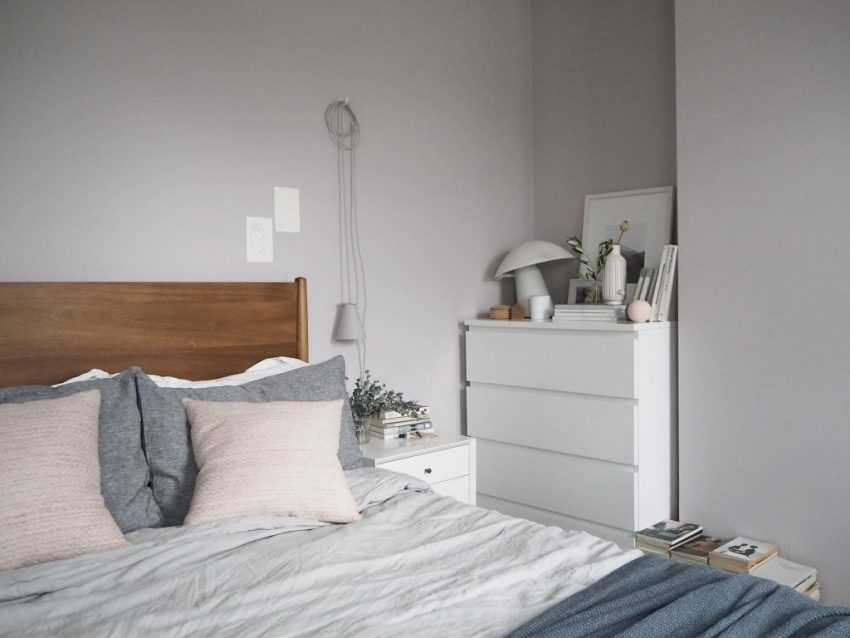 Для этого стиля интерьера характерны белые, серые и бежевые оттенки. Можно добавить несколько ярких акцентов, к примеру, цветное покрывало, ковёр или подушки.