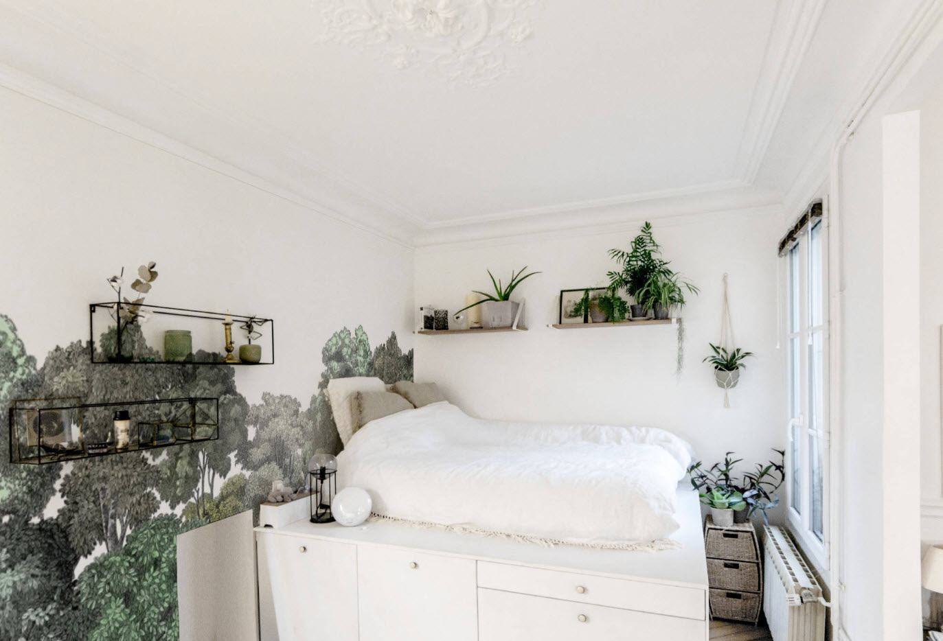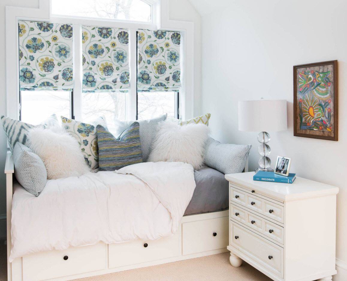 Оформляется прямоугольная комната в светлых оттенках. У одной из стен располагается кровать. В ней могут присутствовать выдвижные ящики для хранения постельного белья и спальных принадлежностей. Рядом с кроватью нужно обозначить территорию для маленького комода.