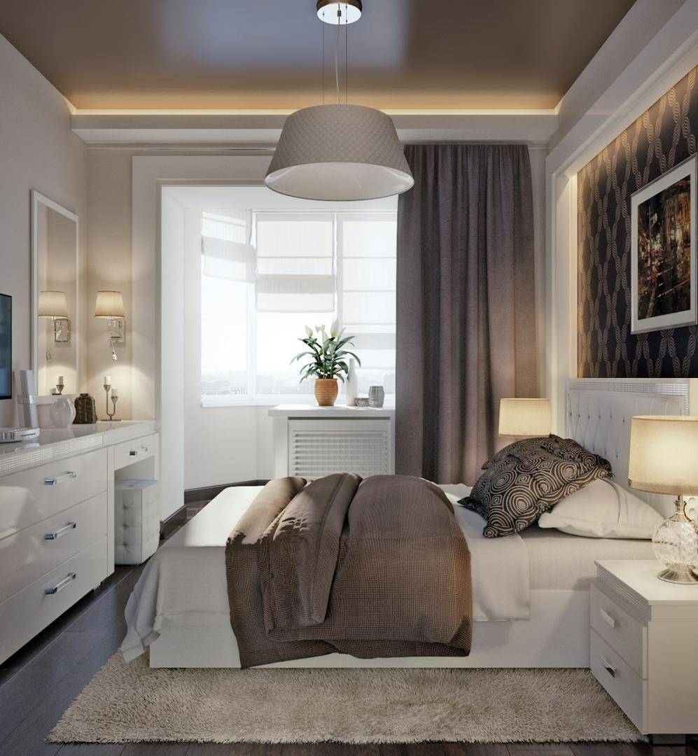 Чтобы визуально расширить пространство используйте светлые тона. Неизменным королем в этом случае является белый. Для спальни также отлично подходит серый. Психологи утверждают, что он положительно влияет на нервную систему человека, и способствует полному восстановлению