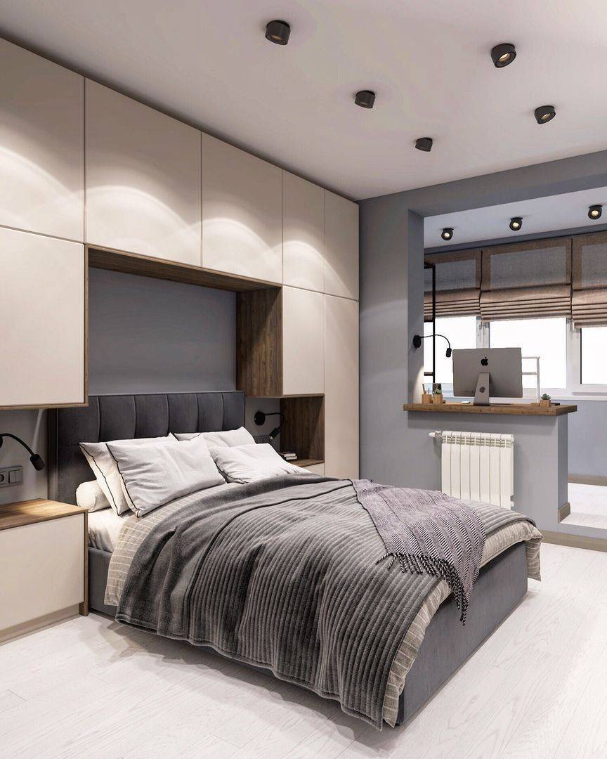 Обустройство спальни начинается с расположения ложа и классическим решением становится установка её изголовья у одной из стен (при условии, что ноги не «смотрят на выход – плохой знак и не по фен-шуй). Чтобы сэкономить пространство и создать место для хранения вещей, над изголовьем можно повесить несколько шкафов или открытых полок. Рабочая зона в небольшой спальне может располагаться у окна – естественный свет и живописный вид придадут работоспособности. Посмотрите, как удачно и незаметно расположился рабочий стол в этой спальне.