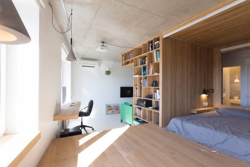 Очень смелое, но интересное и функциональное дизайнерское решение. На подиуме можно поставить кровать, а в конструкции – разместить выдвижные ящики. Такая конструкция сэкономит место и выделит зону для отдыха.