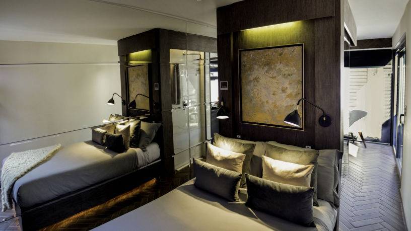 В спальне с гардеробной и диваном либо узкой кроватью можно сделать и распашные двери, потому что позволит свободное место. Они могут быть такими же по дизайну, как и двери в комнату, либо повторять рисунок и рельеф основного стиля помещения.