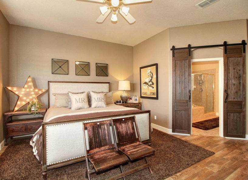 Отделить гардеробную от спальни можно раздвижными дверями в тон декора всей комнаты.