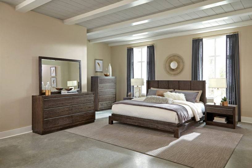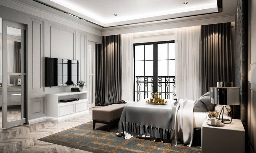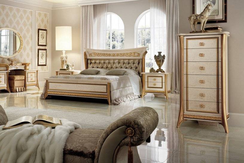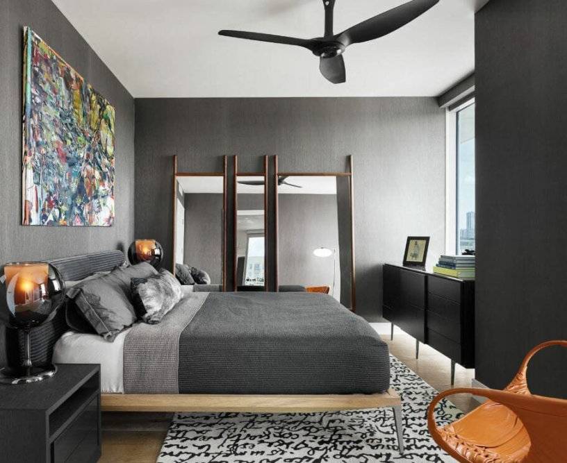 Центральное место выделяют под кровать, она располагается у стены, изголовьем перпендикулярно окну, чтобы исключить попадание в зону сна прямых солнечных лучей. В качестве мебели выбирают модульные элементы и шкаф-купе. Для визуального расширения пространства предпочтение отдают зеркальным дверцам. Не стоит останавливаться на миниатюрной мебели, она плохо сочетается с большой кроватью.