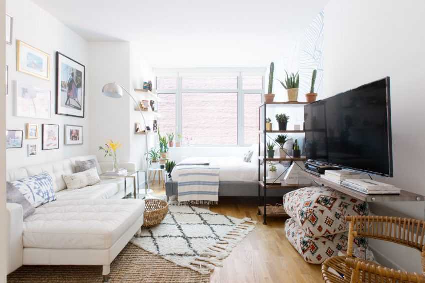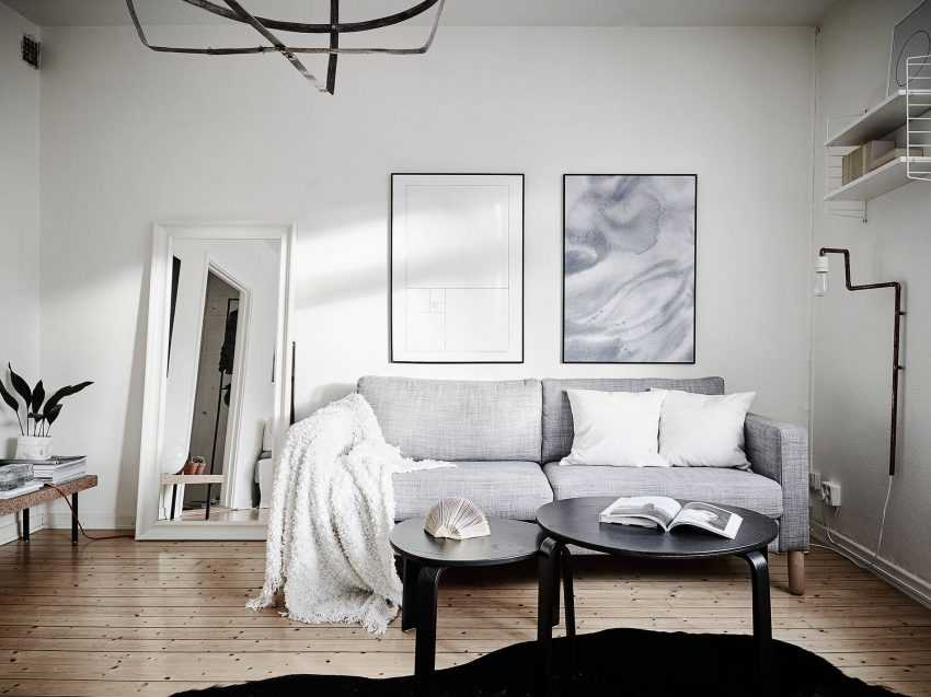 Совет. Чтобы множественные предметы мебели не занимали много пространства, покупайте низкие диваны и кресла с низкими спинками. Журнальный столик лучше выбрать со стеклянной столешницей. Корпусную мебель замените оригинальными неглубокими полками открытого типа и двусторонними стеллажами. Их рекомендуется использовать и в качестве перегородок для зонирования.