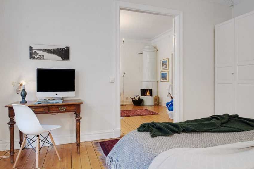 Рабочий кабинет размещается в спальне для лучшего использования площади помещения. Кроме того, спальня предоставляет больше возможностей для уединения в работе, что невозможно в гостиной или на кухне. Лучшее место для рабочего стола возле окна, где больше всего естественного освещения. Кроме того, подоконник окна можно использовать в качестве дополнительной площади стола.