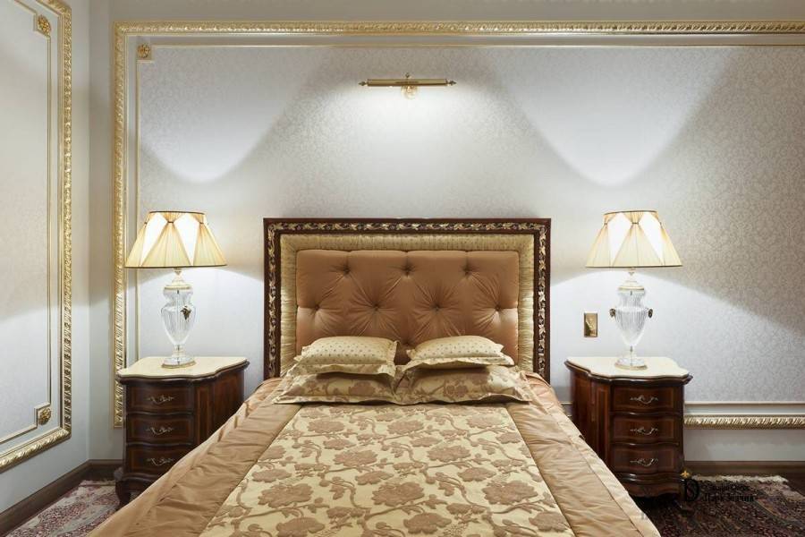 В отделке очень гармонично сочетаются бежевый, золотистый и белый цвета с элементами бронзы. Текстиль следует подбирать светло-синего или зеленого цвета