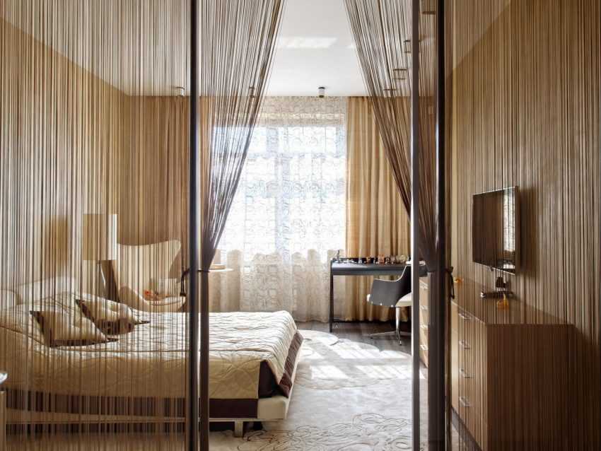 Светло-коричневая узкая спальня с нишей за изголовьемИсточник лон-дон.рф