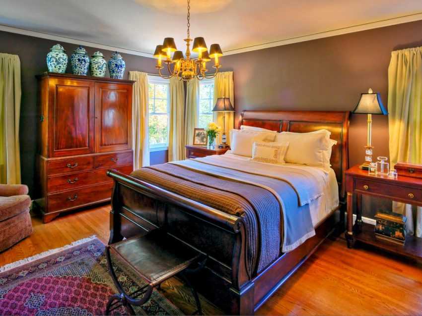 Если помещение достаточно светлое, в нем особенно гармонично будет смотреться прямоугольная спальня 18 кв. м. в классическом стиле из натуральной древесины.