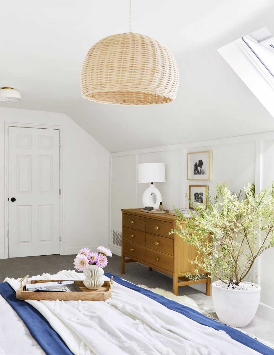 В белой спальне можно акцентировать внимание с помощью дверных полотен, оконных рам, сделав их коричневыми.