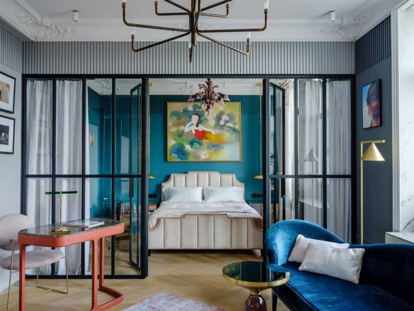 метров в стиле нео-классика привлекает внимание сочным сочетанием цветовой палитры. Стены приглушенного синего оттенка и темный паркетный пол подобраны на контрасте с белыми дверями и спальным гарнитуром