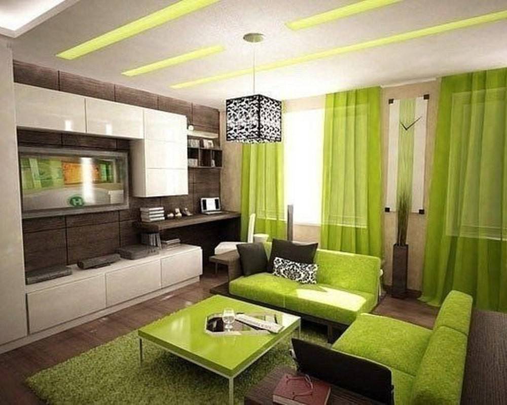 Стол выбирают небольшого размера, подходящий под имеющийся интерьер. А вот от специального столика для телевизора лучше отказаться. Вместо этого, попробуйте установить кронштейны на стену. Так, экономится много места, и выглядит гораздо более стильно. Для гостиной кровать не подходит. Поэтому лучше отдать предпочтение раздвигающемуся дивану. Что касается шкафа, то лучше всего, чтобы он доставал до потолка. Но рассмотрите вариант с навесными полками. Возможно, благодаря им, удастся обойтись и без громоздкого шкафа.