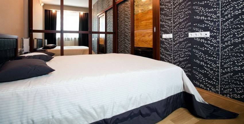 Кроме того, можно установить раздвижную дверь и поставить перегородку со звукоизоляцией. Если есть чувствительность к ультрафиолету, хозяева вешают плотные занавеси из светонепроницаемой ткани.