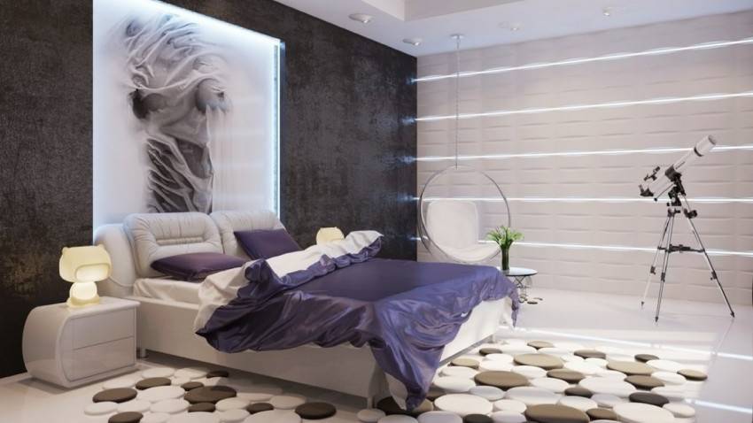 Гармонизирует эмоциональное состояние. Предполагает использование светлых, желательно белых тонов с синими, бирюзовыми либо другого цвета акцентами. Актуальны необычные формы, часто находят применение гексагональные узоры. Текстиль легкий, воздушный, без изысков. В такой комнате легко поддерживать порядок.