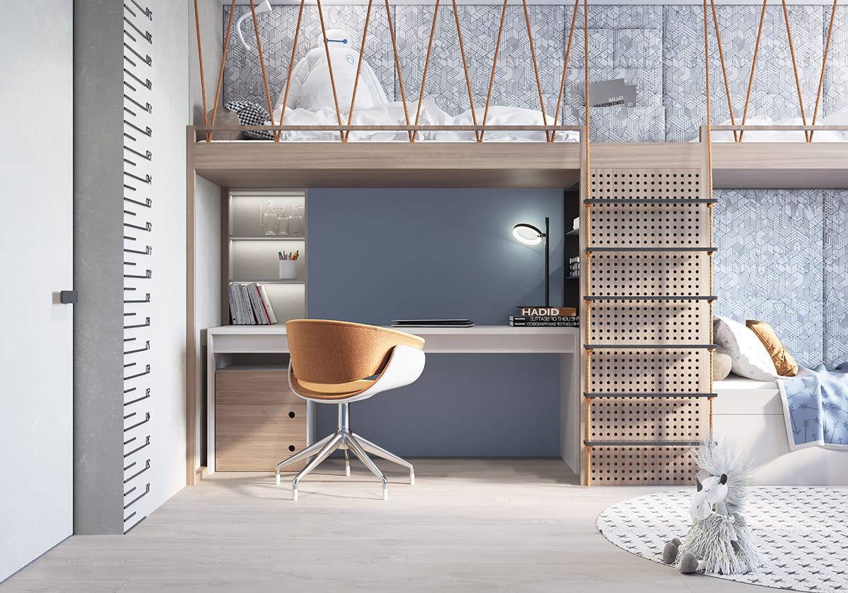 При планировании спальни для подростка площадью до десяти квадратных метров стоит рассмотреть вариант совмещения в одной конструкции односпальной кровати и рабочего стола. Кровать в этом случае располагают на втором ярусе.