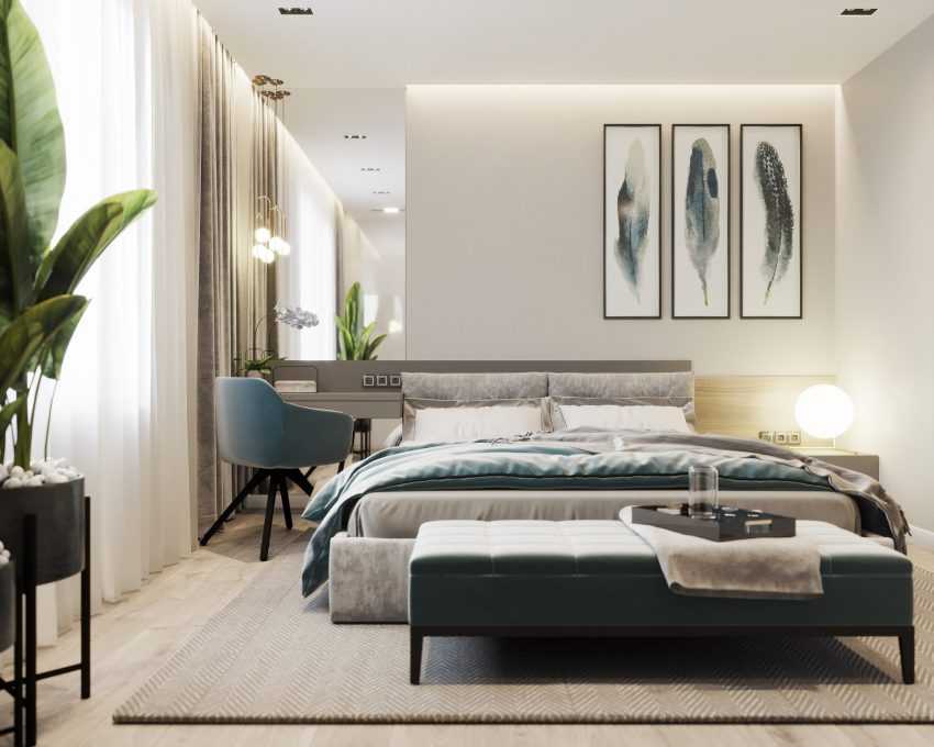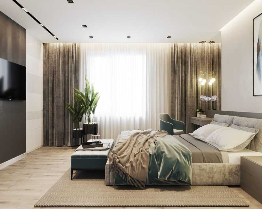 Допускаются акценты в виде картин, изысканных торшеров, керамических фигур, комнатных растений. Постельное белье должно быть шелковым либо хлопковым, без заметных принтов. Точечное светодиодное освещение по периметру и прикроватные бра с матовыми молочно-белыми плафонами помогут создать спокойную атмосферу и настроиться на безмятежный сон.