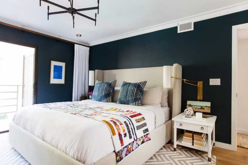 Обрати внимание на то, что с помощью цветов и рисунков можно корректировать геометрию комнаты. Если на фоне светлой отделки одну стену сделать темной, она визуально приблизится – это хороший прием для маленькой узкой спальни