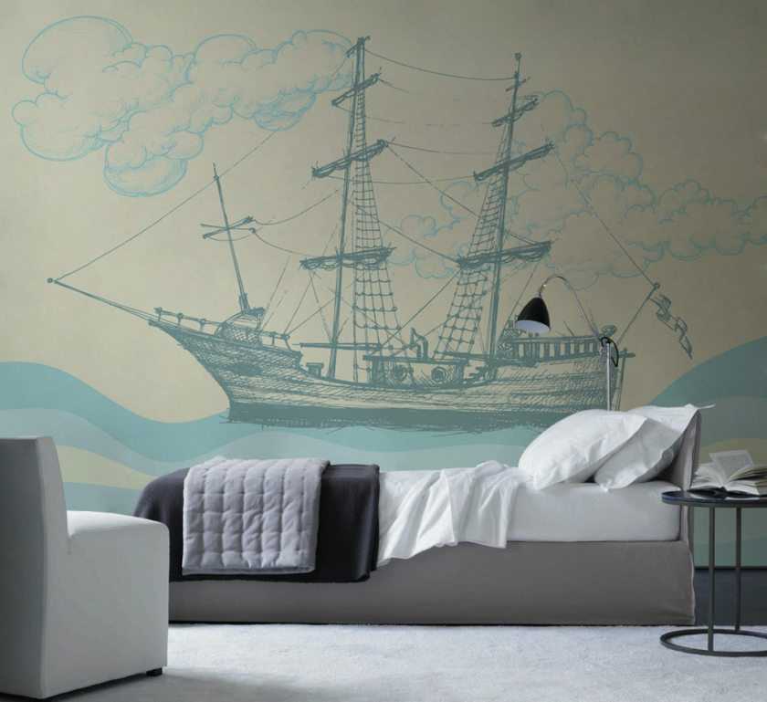 В детскую спальню наклейте фотообои, где изображен морской царь Нептун или необитаемый остров, окруженный со всех сторон водой. Если комната просторная и светлая, то реализовать можно любые фантазии.