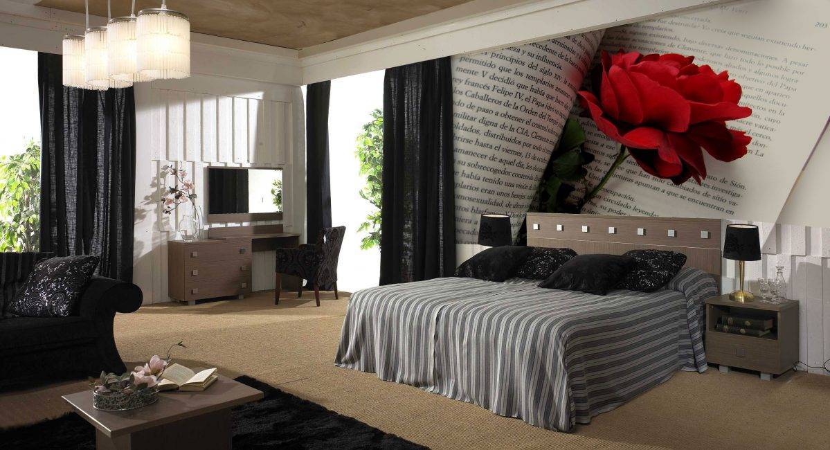 Один из популярных цветочных мотивов, ярко-красные розы на черном фоне или орхидеи, не совсем подходит для спальни. Контрастные цвета в интерьере мешают расслабиться после длинного трудового дня и настроиться на полноценный сон. Гораздо лучше разместить на стенах нежные полевые цветы, созревшие поля или водную гладь – цветовая гамма этих изображений как нельзя лучше успокаивает, способствует скорейшему восстановлению жизненных сил.