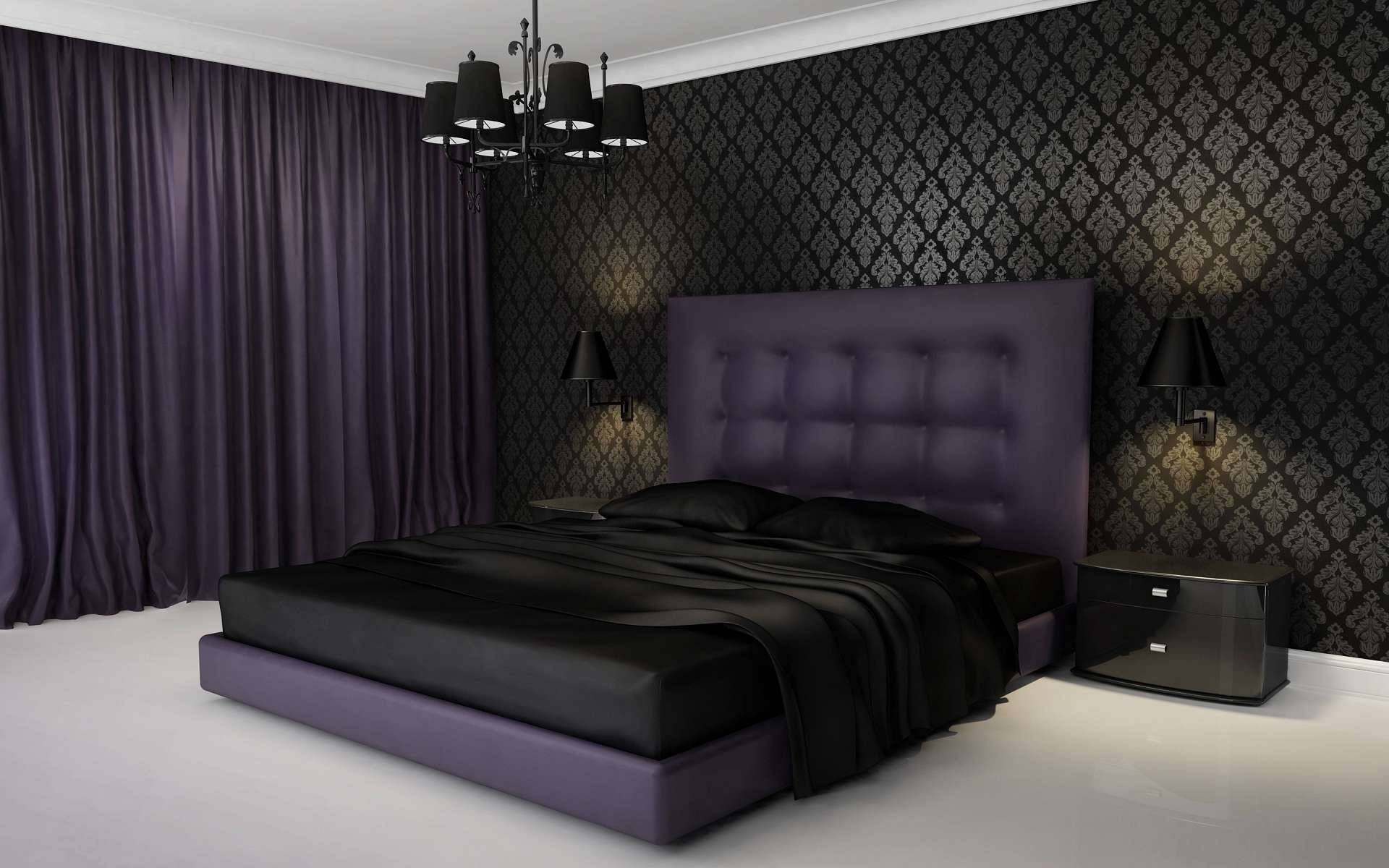 - Черный. Если есть желание создать спальню в готическом стиле, то черно-фиолетовая гамма отлично в этом поможет. Однако все же лучше разбавить мрачные тона добавлением светлых, например, повесив на стену яркие картины или коллажи.