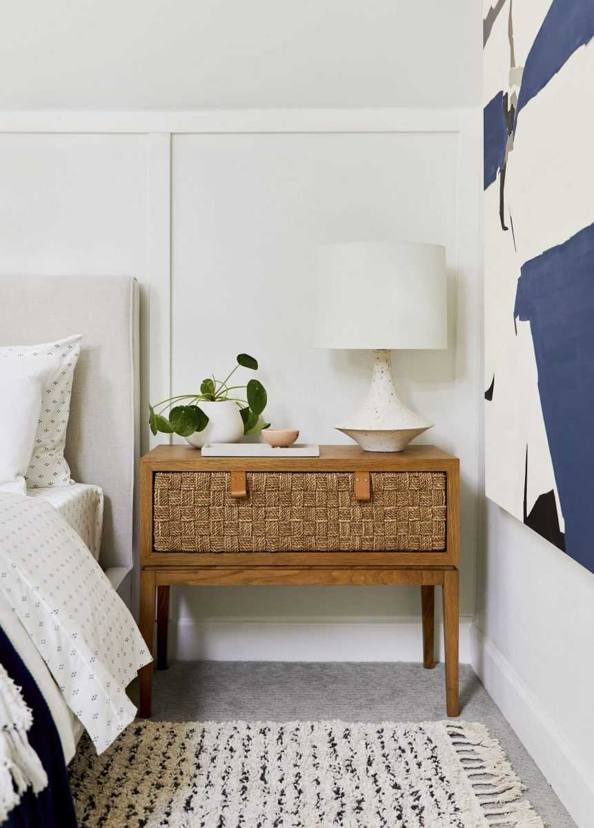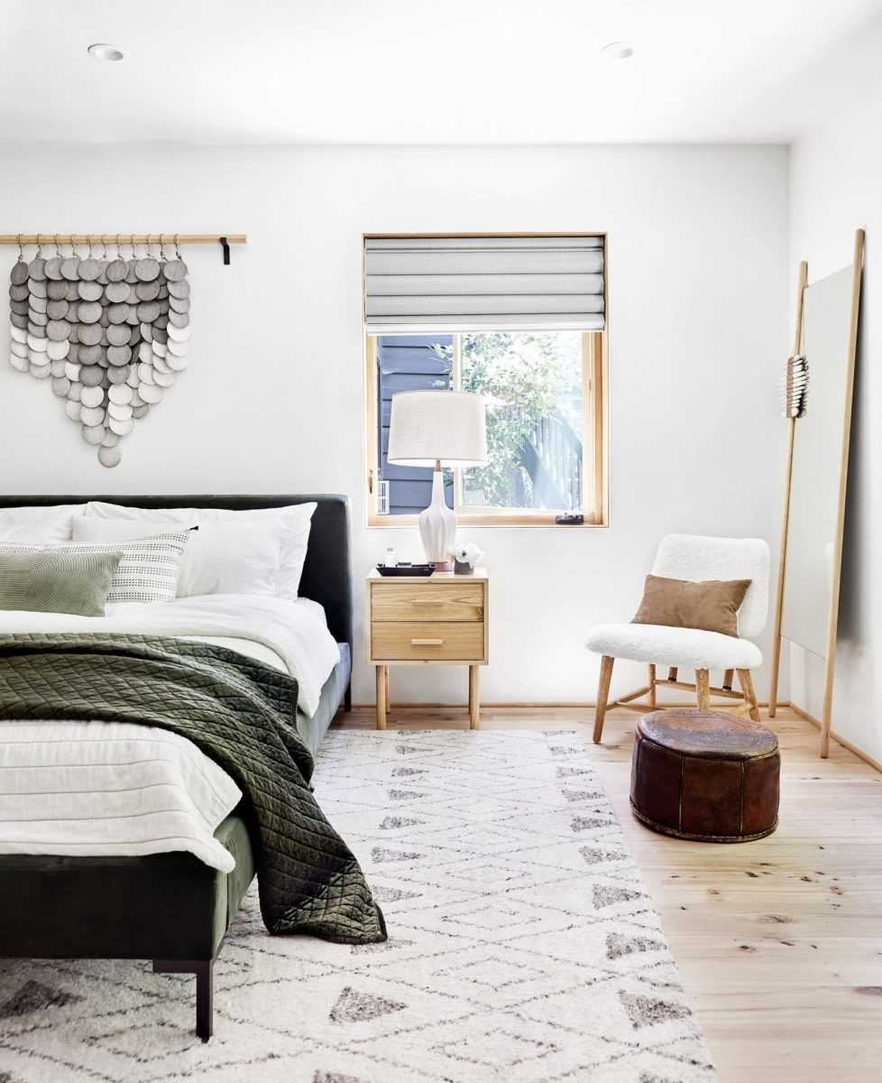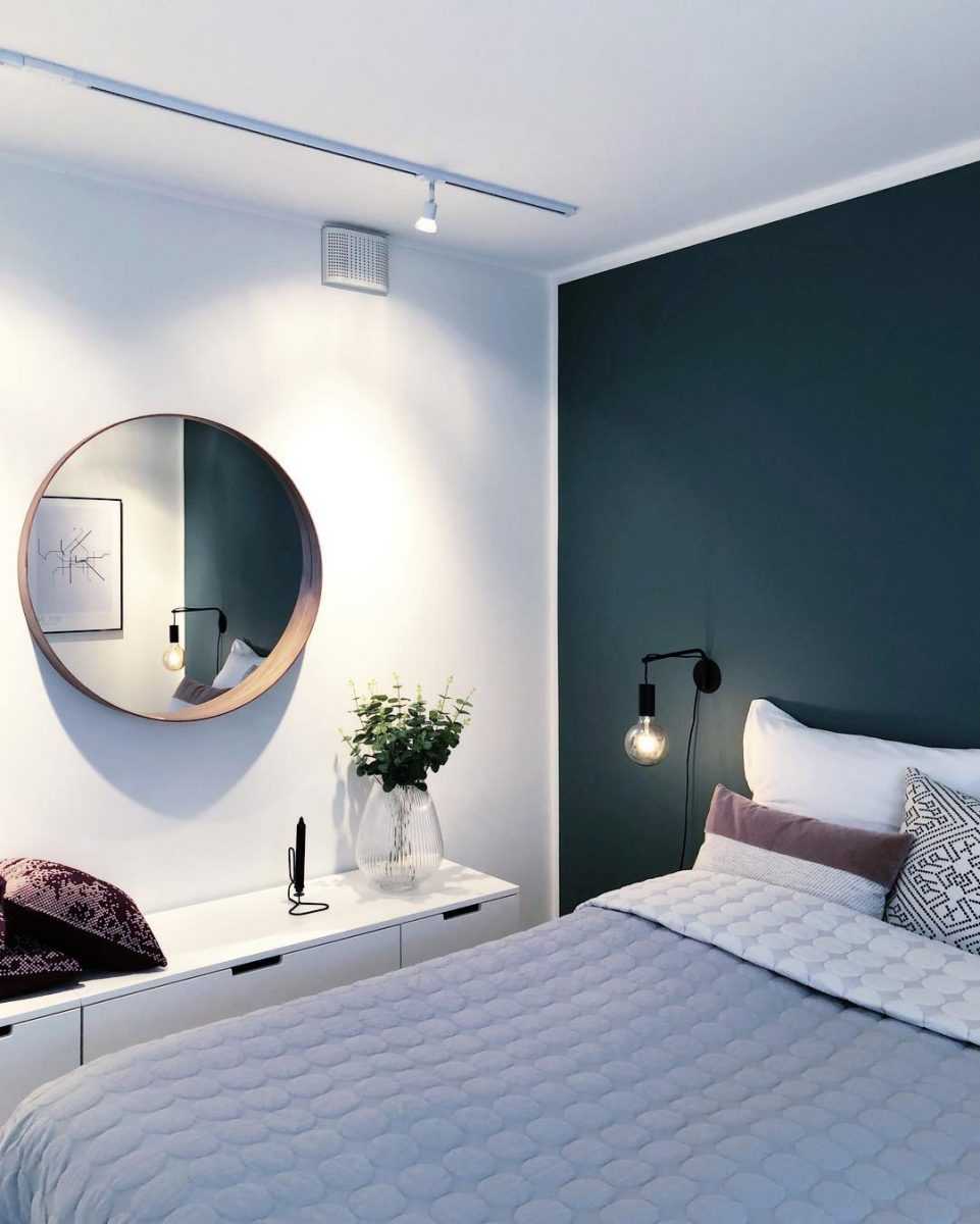 Для современного стиля в спальне можно использовать стену, отличающуюся от основных стен. Это может быть стена с рисунком, состоящим из геометрических фигур или просто однотонная стена, покрашенная в другой цвет.