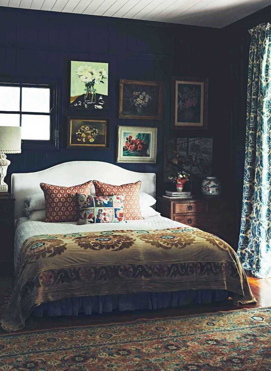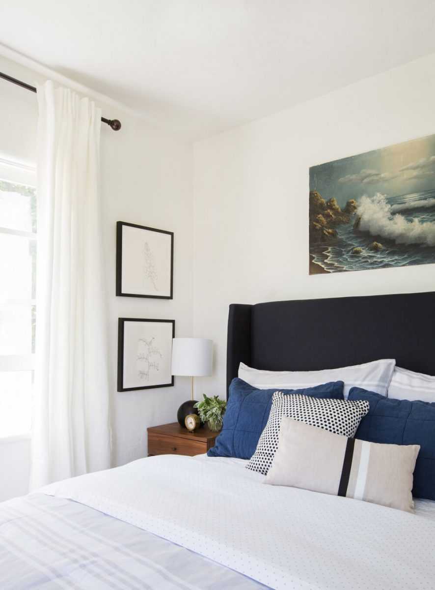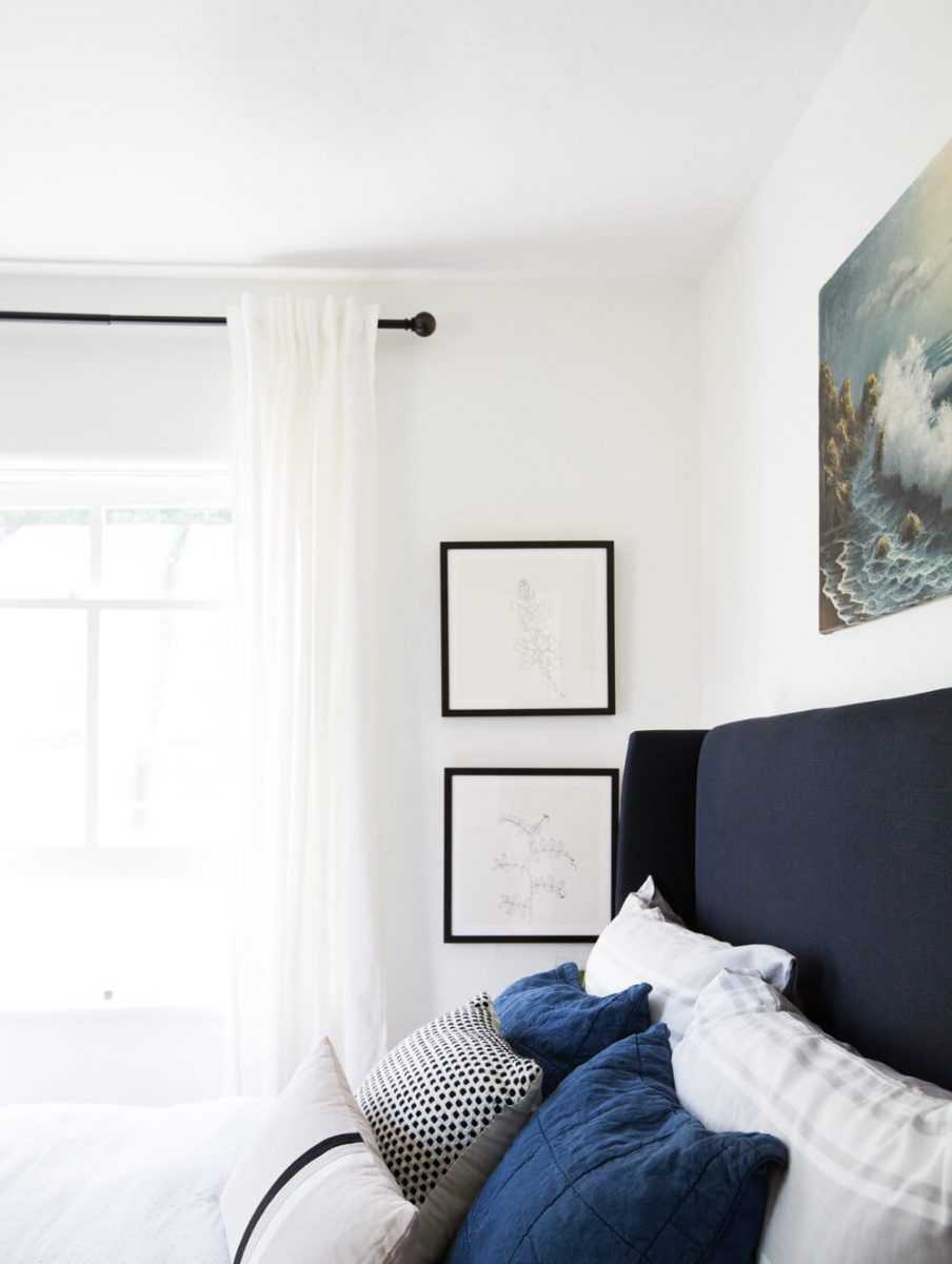 Спокойную умиротворенную обстановку создаст темно-синяя спальня с васильковыми оттенками.