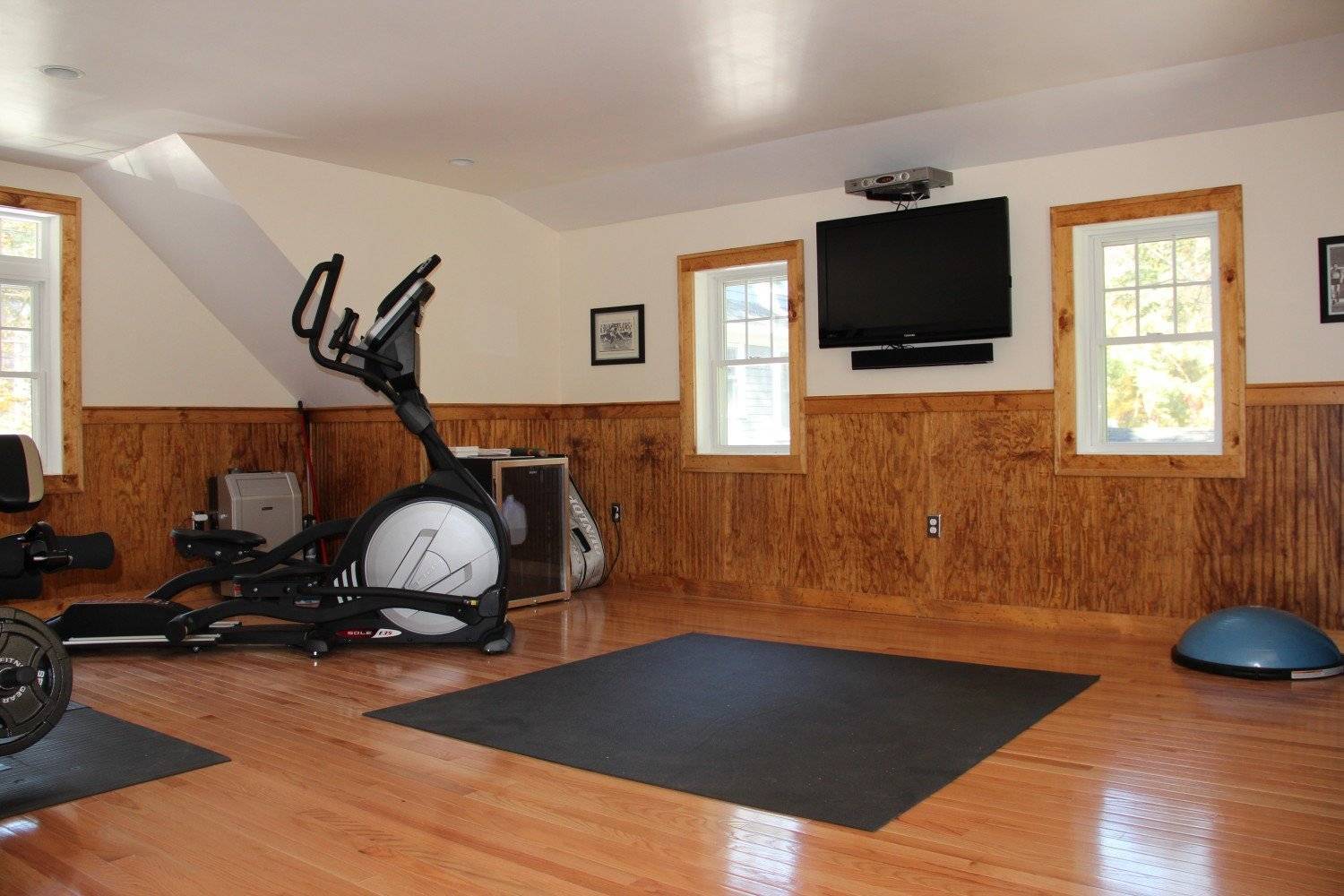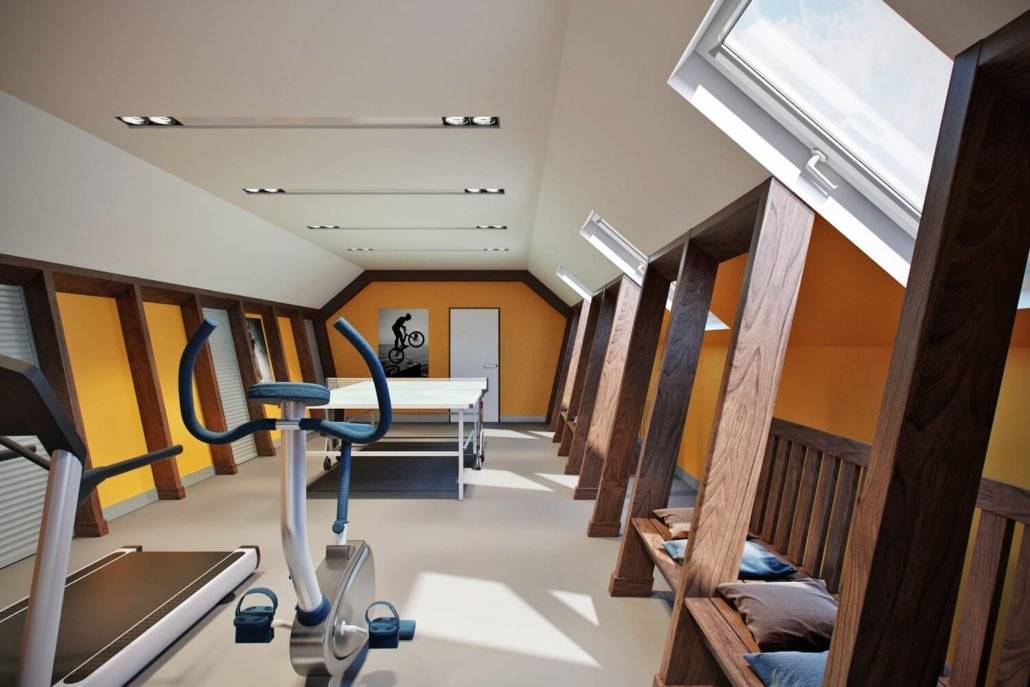 При оборудовании мансарды в качестве спортзала необходимо позаботиться о кондиционере. Из-за нагрева крыши эта часть дома обычно отличается повышенной температурой воздуха.