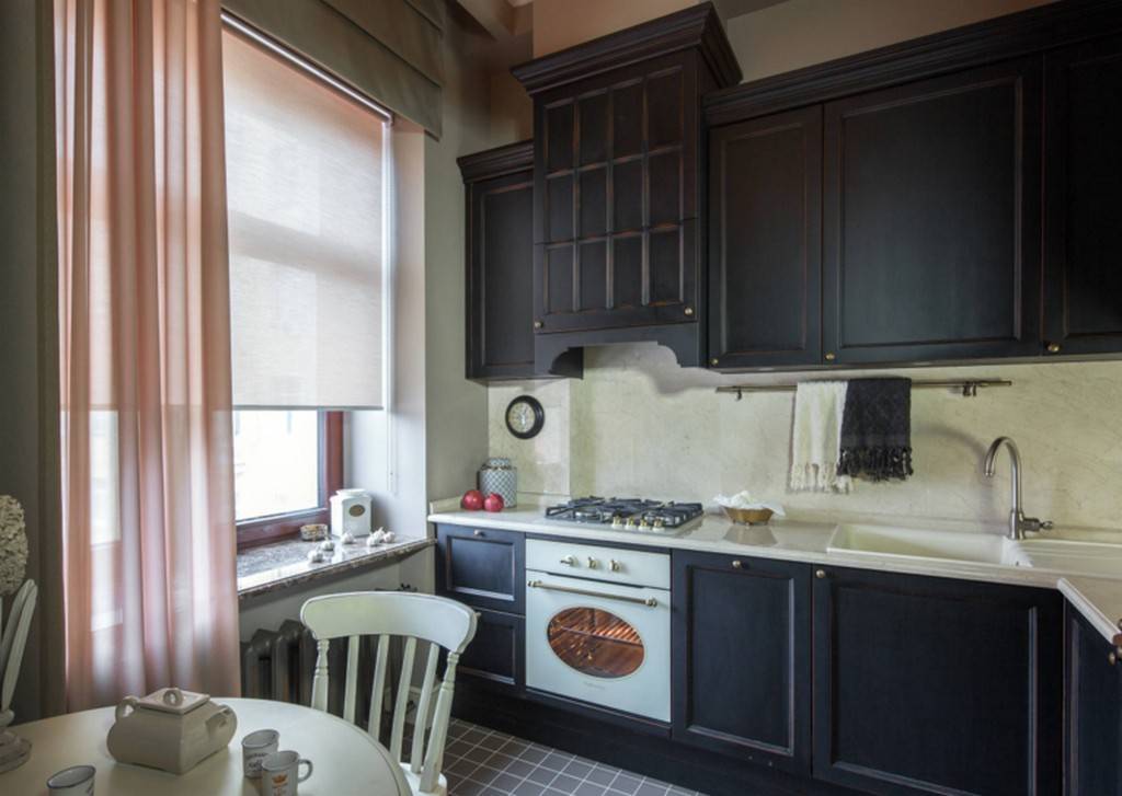 Являются самым популярным и оптимальным вариантом для маленькой кухни. В ход идут подхваты, которые часто идут в комплекте со шторами.