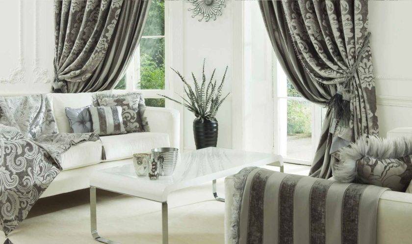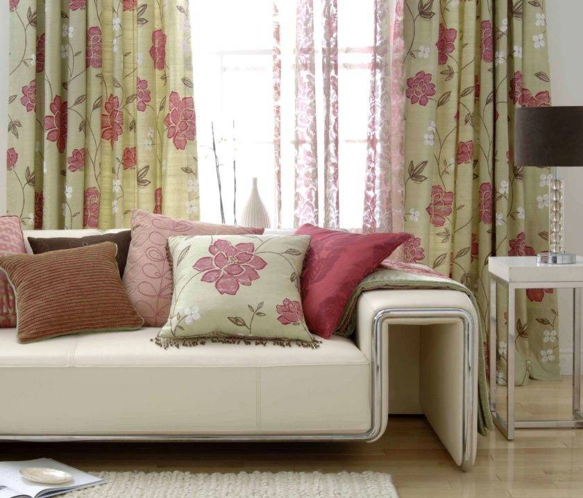 Сочетание узоров на шторах и подушках – отличное решение для создания домашней обстановки в зале. А дополнение в виде других оттенков штор даст возможность немного менять общий вид комнаты.