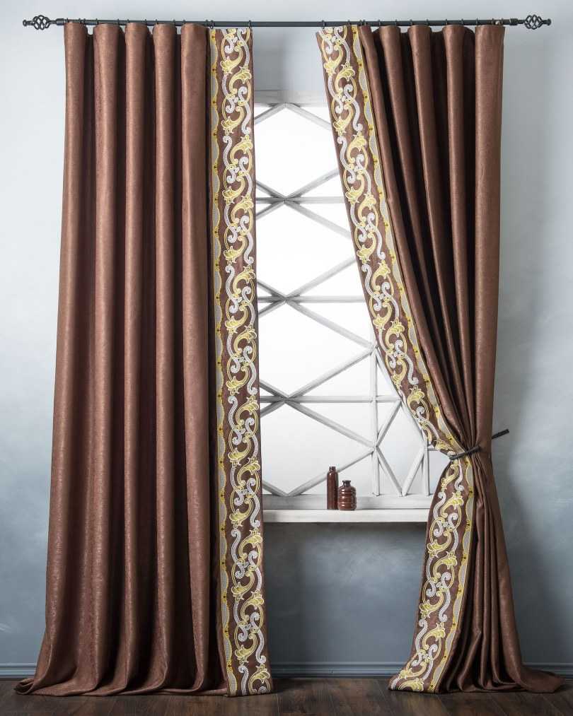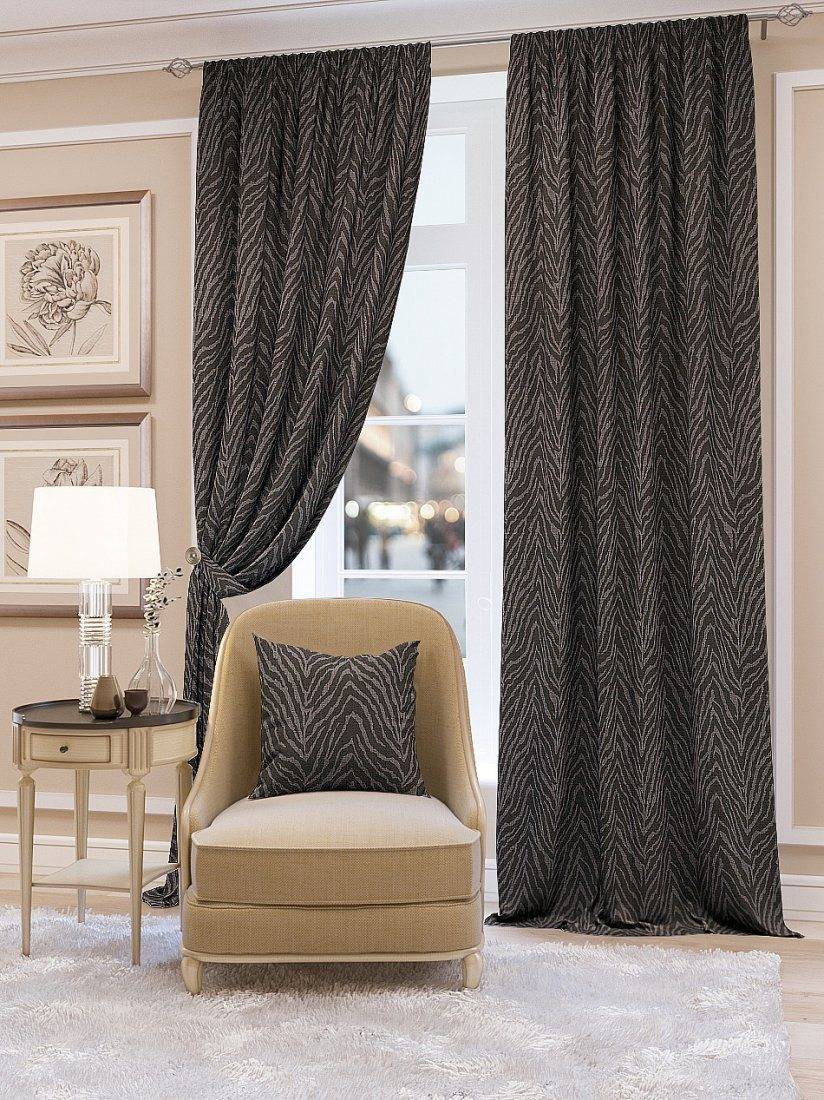 Такой колоритный интерьер могут украсить велюровые шторы, которые чем-то напоминают по внешнему виду замшу. Также подойдут занавески из ткани бурого, шоколадного, темно-графитового или бежевого цветов.