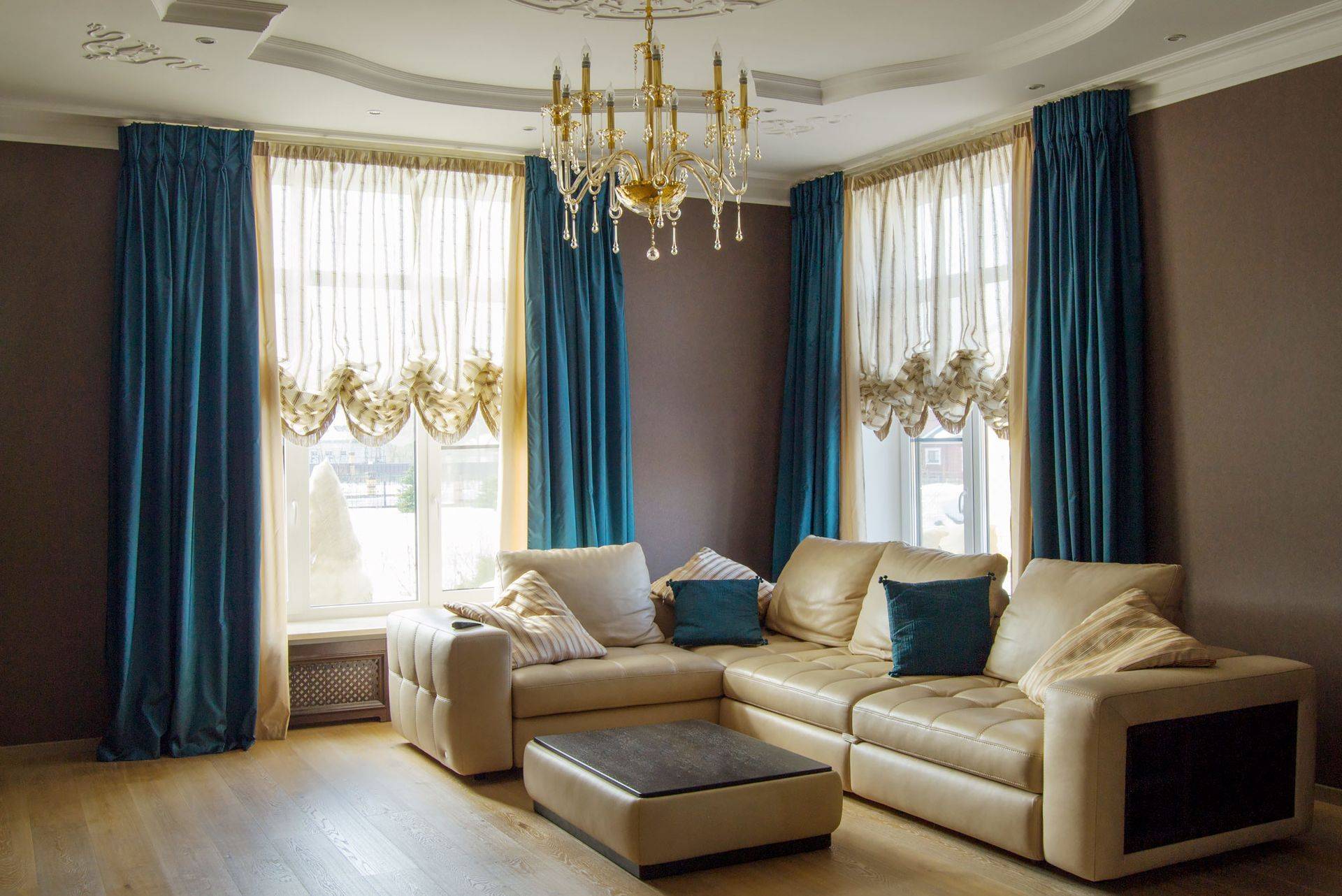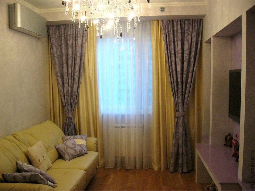 Важно помнить, что легкие и светлые ткани выбирают для небольших помещений или когда необходимо создать фон, например, в комнатах с большим количеством мебели. Для просторных гостиных используют многослойные, разноцветные варианты