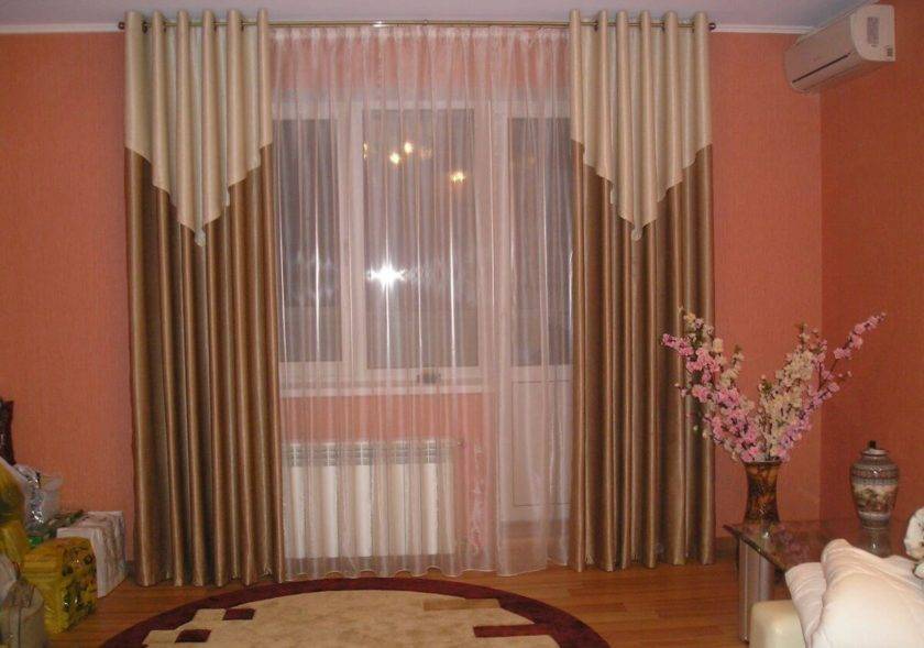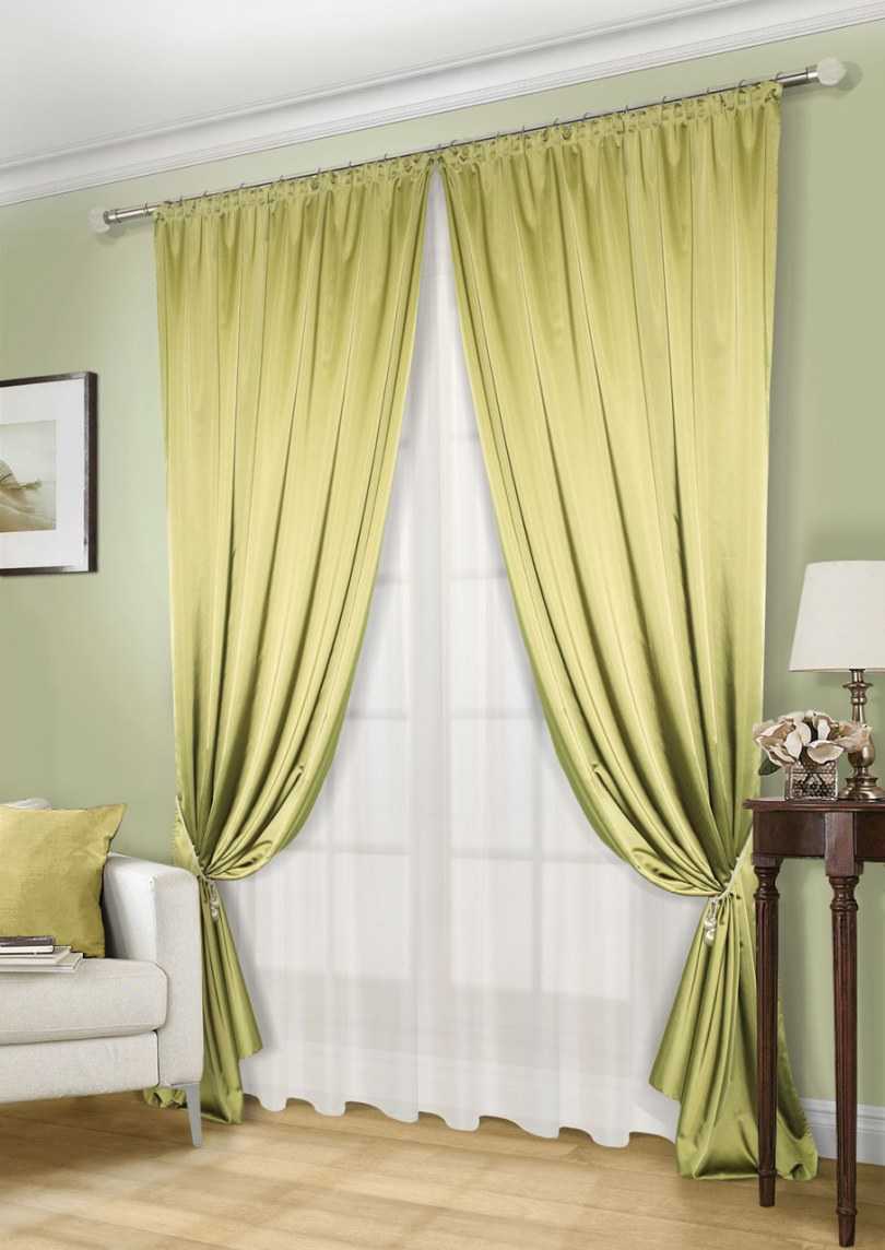 Красивые шторы в зал с драпировкой смотрятся элегантно, если основные гардины выполнены из легкого текстиля и не имеют яркого цветового решения.