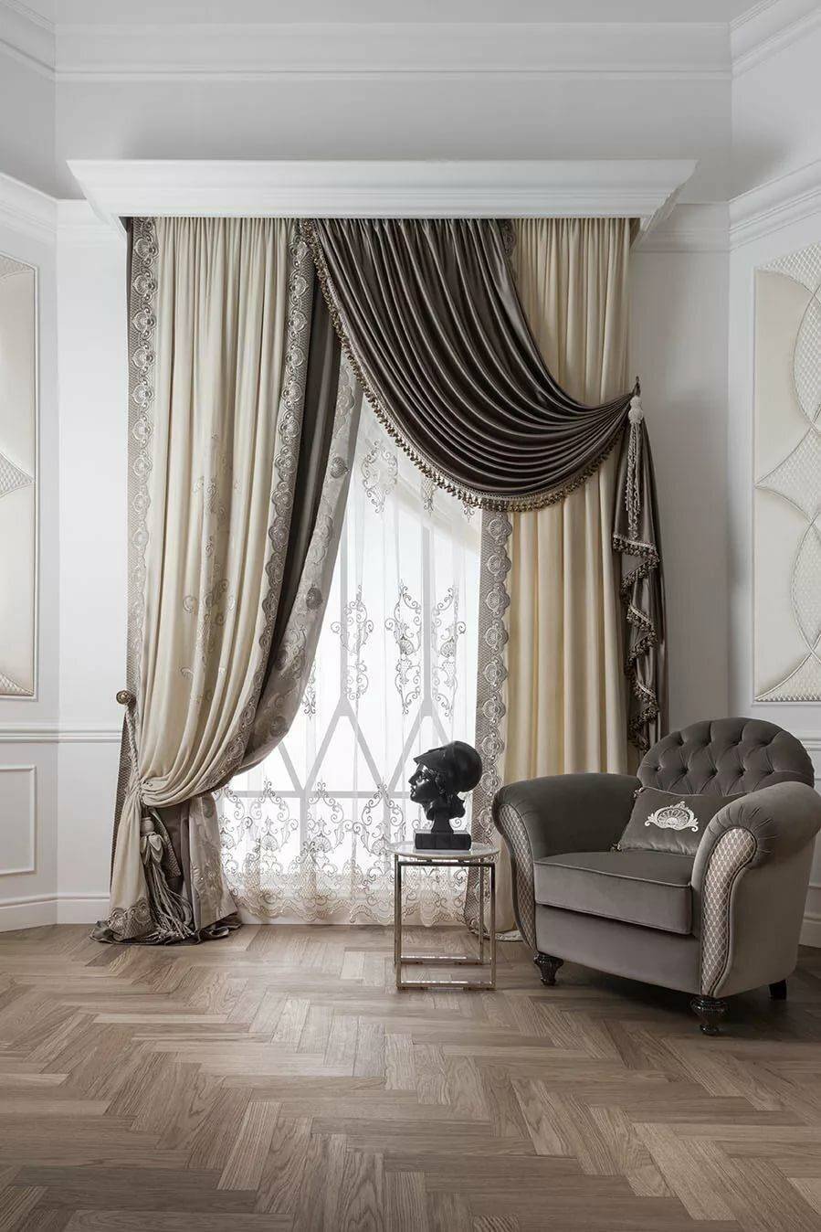 Невероятно красивый дизайн зала дополнен не только шторами с ламбрекенами, но и старинными деталями.