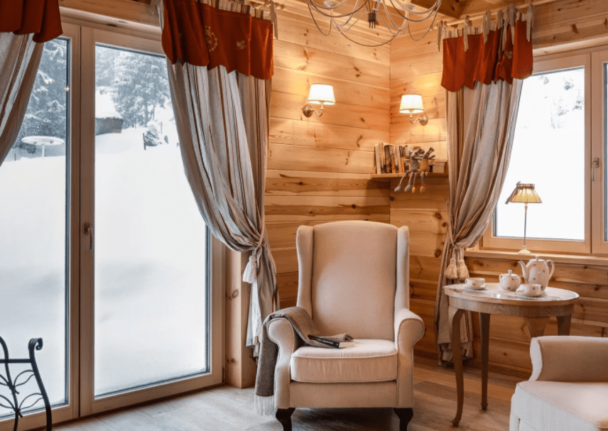 Красный, белый, черный – вечная классика, которая всегда будет актуальна. А такое цветовой выбор для штор в сочетании с широким окном и зимней сказкой дарит особое ощущение тепла и уюта.