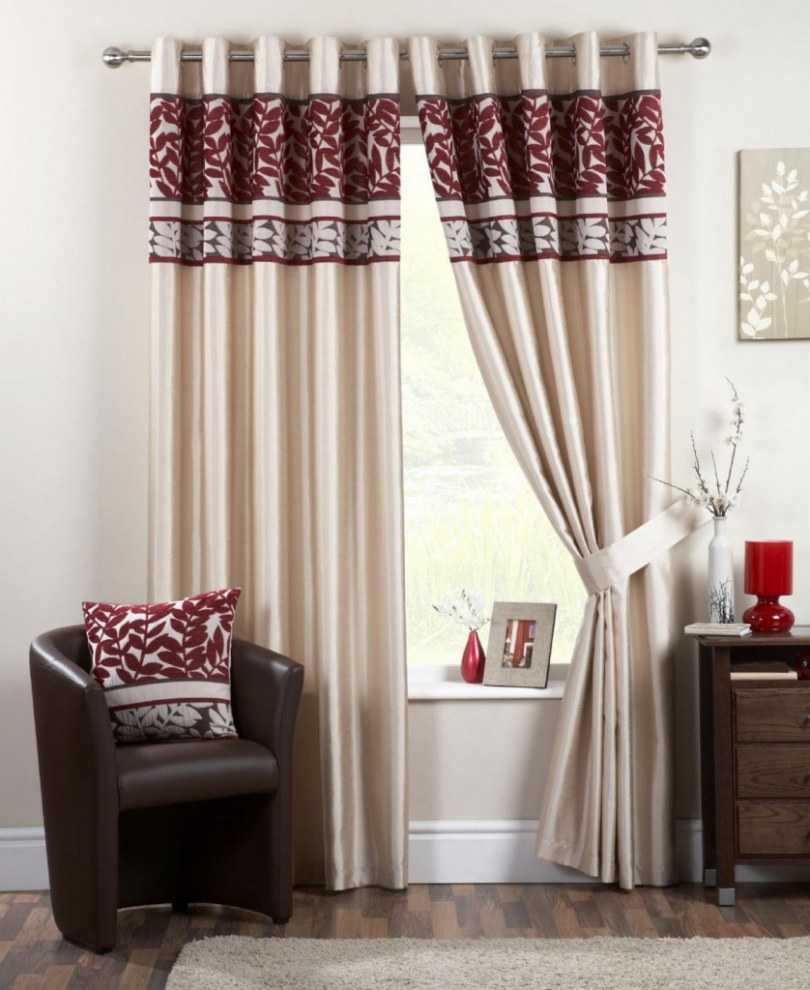 - 1 Выполнить верхнюю, более плотную часть, на которой устанавливаются кольца, из ткани контрастного к шторам цвета, дублирующего расцветку каких-либо элементов интерьера: стен, текстиля, диванных подушек. Люверсы в этом случае лучше выбрать в цвет штор. Например, синий верх с зелеными люверсами и зеленые шторы.