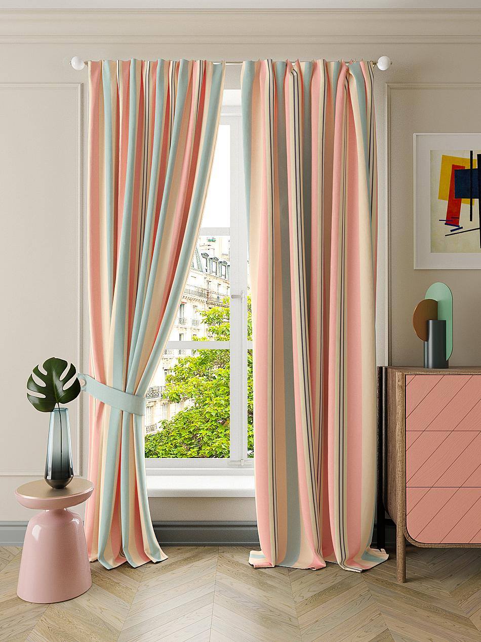 · Полосы. Широкие и обязательно горизонтальные, будто делящие шторы на секции. Беспроигрышный вариант — чередование белого и темного (синего, красного, зеленого) оттенка, но возможна выдержка в одной палитре с различием в пару тонов.