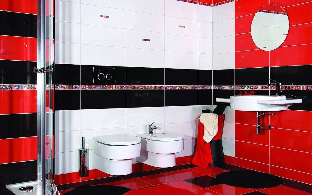достаточно популярным решением является использование акцентных участков. К примеру, вся стена облицовывается плиткой бежевого цвета, а ее часть, расположенная за унитазом, делается более яркой с контрастными переходами