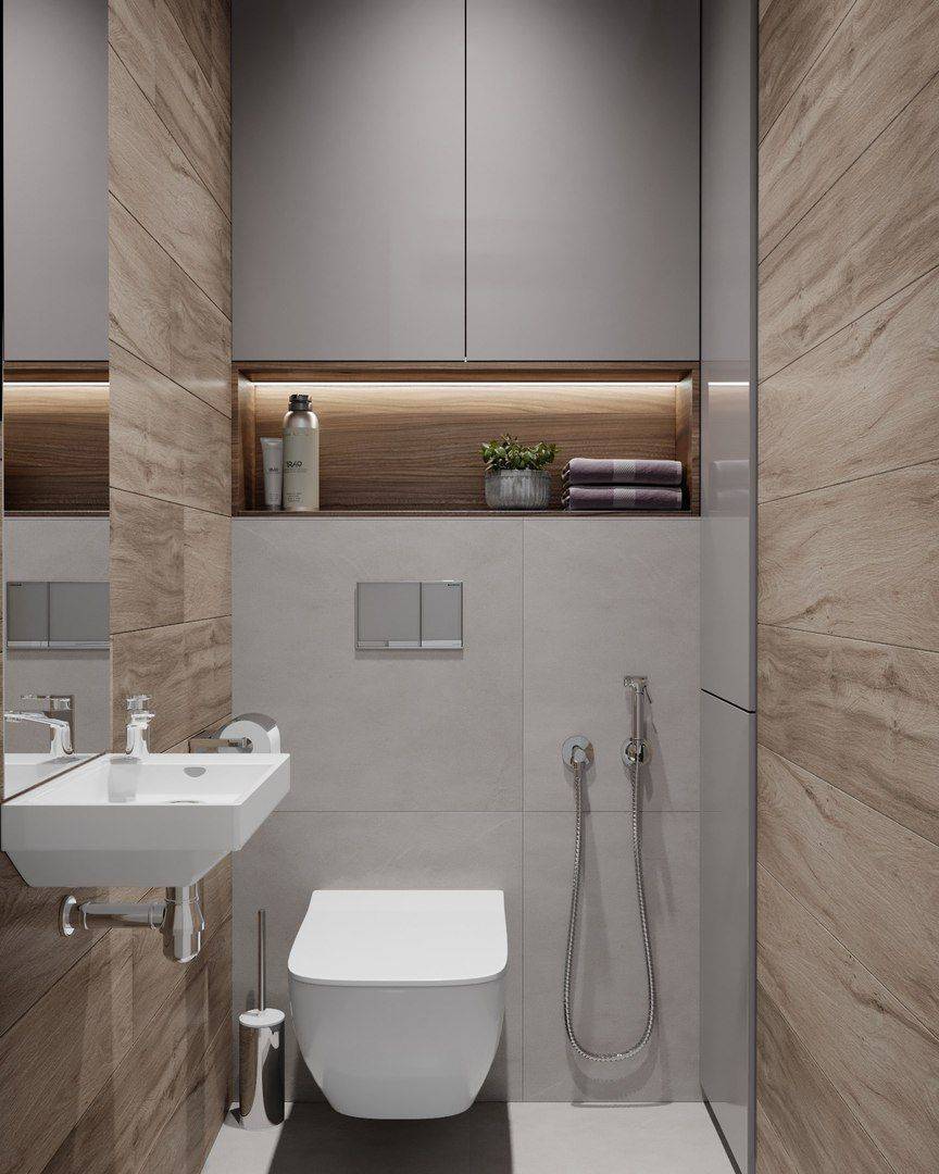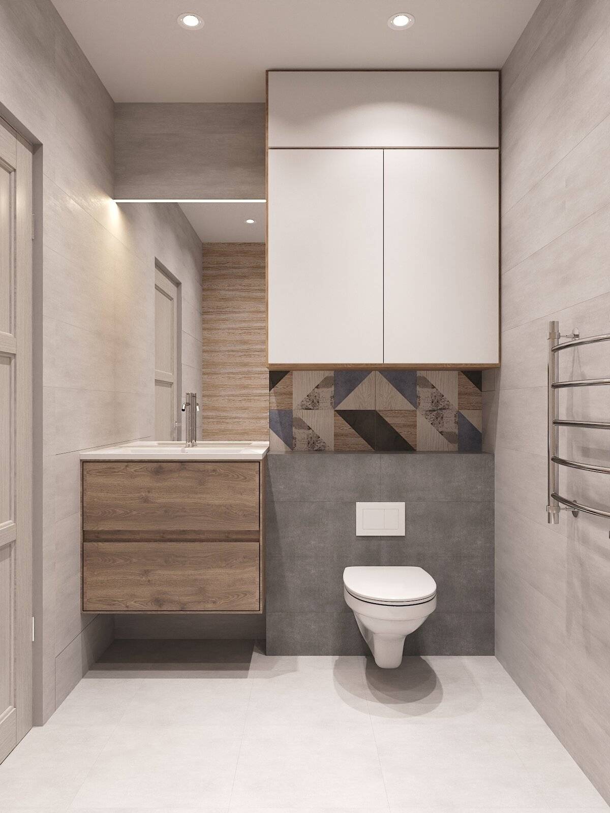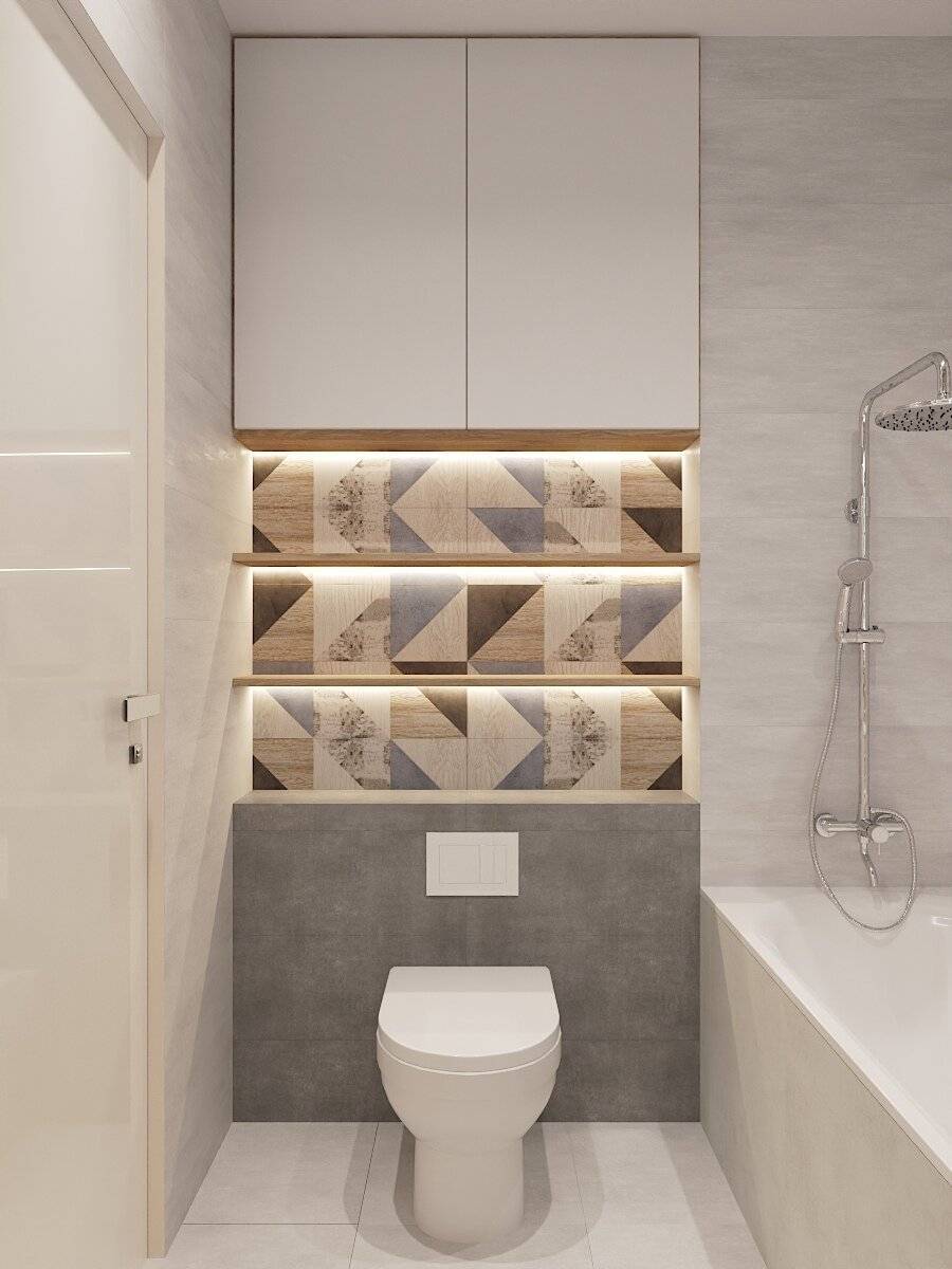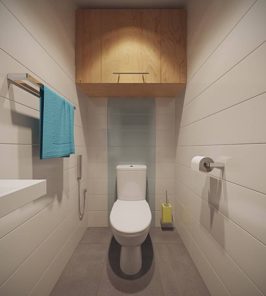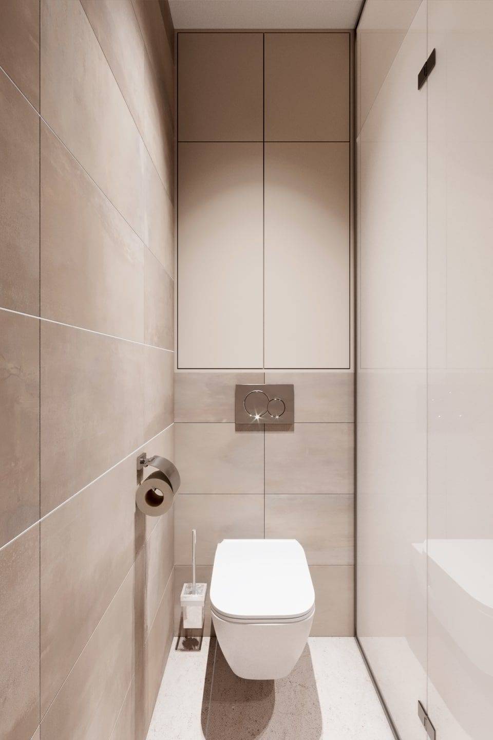 На фото отделка стен и пола плиткой большого размера, шкаф встроен в стену и не выступает над унитазом для экономии пространства.