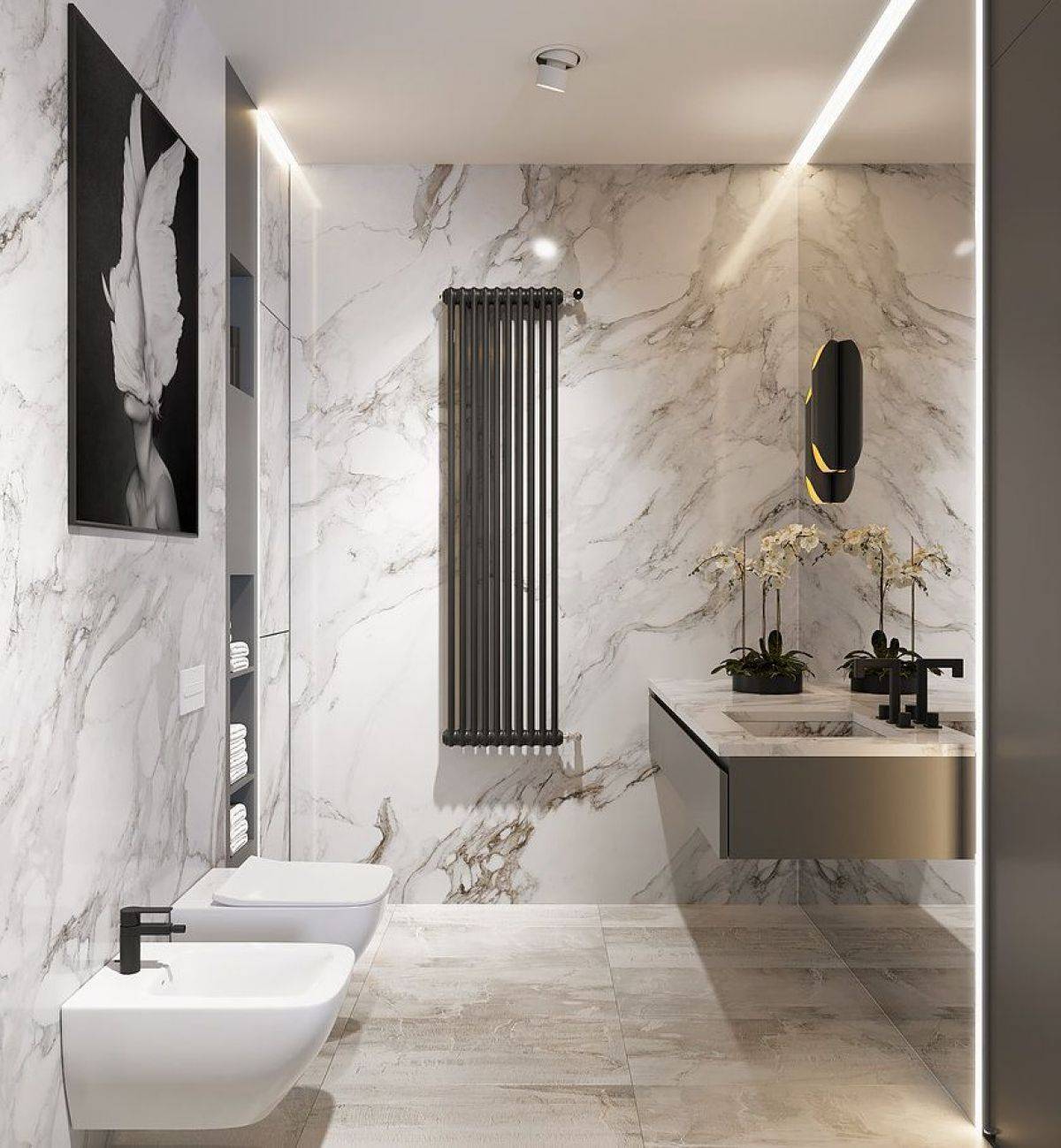 Классика. Этот стиль подразумевает лаконичный цвет оформления, традиционный выбор сантехники, ее расстановки. Очень гармонично может смотреться мрамор в золотых оттенках.
