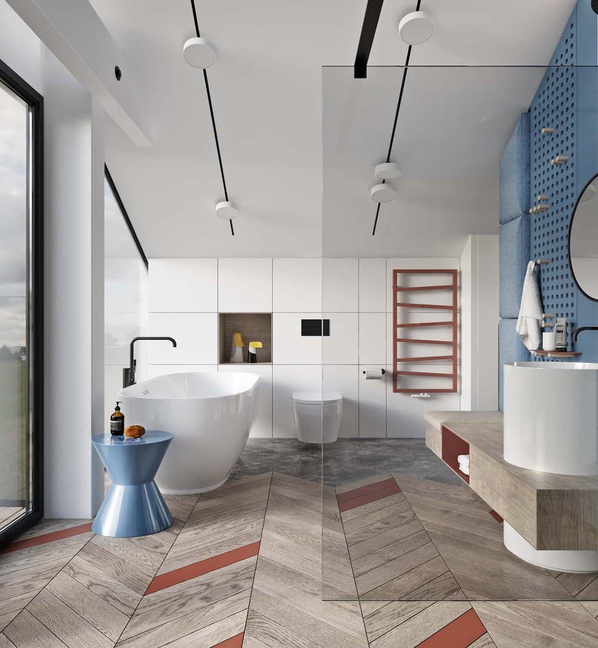 Современная ванная комната любит комфорт и последовательность, поэтому уделите этому особое внимание. Современный – не значит монохромный, но определенно лучше избегать пестрых схем